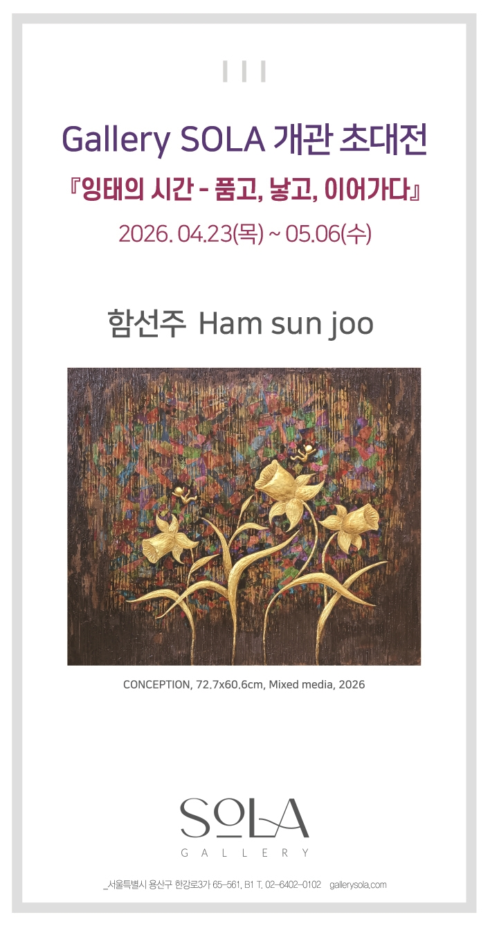 [함선주 초대개인전] ■Gallery SOLA 개관 초대전■ 《잉태의 시간 - 품고, 낳고, 이어가다》 -전시기간: 2026.04.23(목) ~ 05.06(수) *휴관일:토,일 -관람시간: 11:00~18:00(17:30입장마감) -장소: 갤러리 SOLA 서울특별시 용산구 서빙고로24길 12(이촌역 5번출구 약 590m) ‘CONCEPTION(잉태)’를 통해 생명의 소중함, 가족사랑, 저출산, 고령화로 대표되는 현대사회의 구조적 문제를 예술적 언어로 전달하고자 한다. 급변하는 사회 속 출산과 양육이 개인의 문제가 아닌 사회 공동체의 문제로 바라보고, 고령화 사회 속에서 세대가 서로를 어떻게 이해하고 공존할 수 있을지에 대한 생각을 나누고자 한다. ‘잉태의 시간-품고, 낳고, 이어가다....... <img src="https://blogthumb.pstatic.net/MjAyNjA0MTdfMTk0/MDAxNzc2MzkyNTIyNjIy.4Xhw886MMfhyi9nG92DgycU4SUH4YbSymJSoANYFs0cg.0eErgkVUMWZYHpY3OykdhrHCuGtnYY5WuSQ24XjqGZwg.JPEG/1776325436660.jpg?type=s3" />
