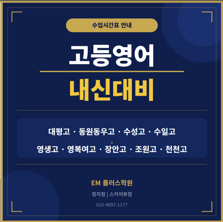 중간고사 시즌이 다가오면서 내신 영어 준비를 시작하려는 고등학생, 학부모님들의 문의가 많이 들어오고 있습니다. 오늘은 많은 분들께서 가장 궁금해하시는 "우리 학교 반은 언제 수업이 있나요?"에 대한 답을 드리기 위해 , 학교별·학년별 수업 시간표를 한눈에 정리해 드립니다. EM플러스학원은 정자점과 스카이뷰점 두 곳의 캠퍼스를 운영하며, 수원시 장안구 내 9개 고등학교 학생을 위한 맞춤반을 구성하고 있습니다. 수능전문강사가 직접 담임제로 책임 지도하는 소수정예(8명) 수업으로, 내신부터 수능까지 체계적으로 준비할 수 있습니다. 내신 영어는 단순히 교과서를 외우는 것을 넘어, 학교별 출제 경향 분석, 서술형 대....... <img src="https://blogthumb.pstatic.net/MjAyNjA0MjBfMTM2/MDAxNzc2NjE5MTE5Mjky.G1qvcuXclHiJBVcQUaXifmscMdoxPaT3gGGXiSZDfaEg.v1u8RGaHLnIDztlOp7PaJukHXikWAsLV8zGgrttErvIg.PNG/image.png?type=s3" />