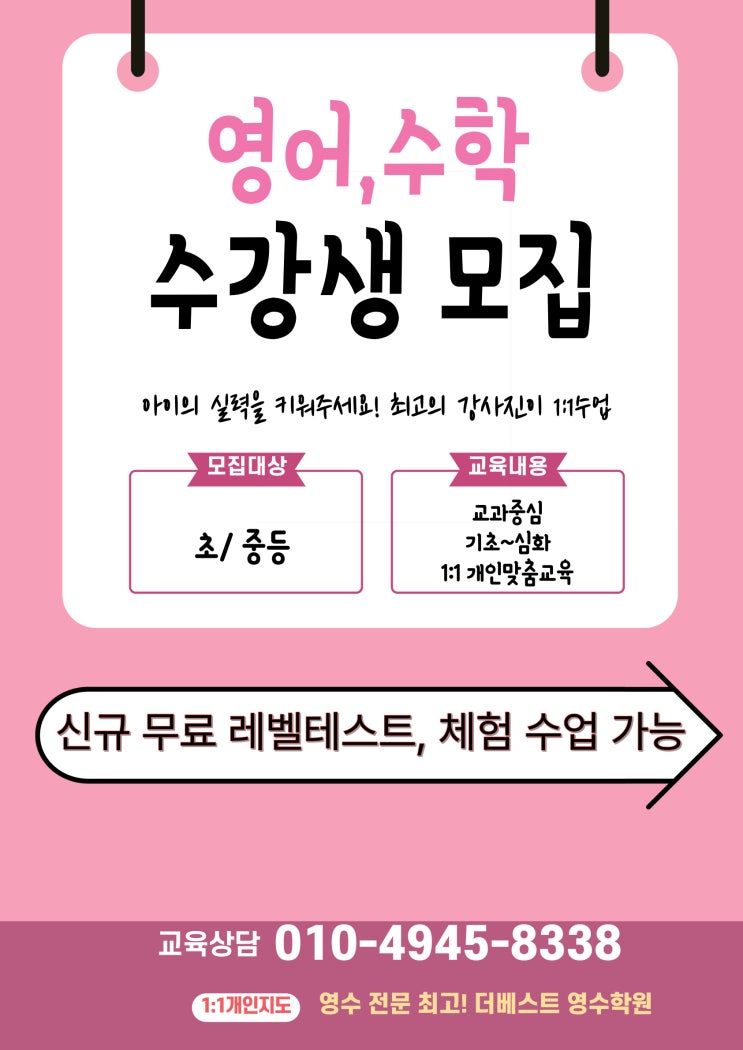 안녕하세요 더베스트 영수학원입니다. 아이의 성적이 고민이신가요? 기초부터 탄탄하게, 실력까지 확실하게 올려드립니다. 왜 더베스트 영수학원인가요? ✔️ 수준별 맞춤 수업 진행 ✔️ 개념 + 심화까지 단계별 완성 ✔️ 학생별 약점 집중 관리 ✔️ 자기주도 학습 습관 형성 단순히 문제만 푸는 학원이 아닌, “이해하고 생각하는 힘”을 키워주는 수업을 진행합니다. ✏️ 이런 학생에게 추천합니다 ✔️ 수학, 영어 기초가 부족한 학생 ✔️ 성적이 정체되어 있는 학생 ✔️ 중등 대비, 심화학습이 필요한 학생 ✔️ 공부 습관을 제대로 잡고 싶은 학생 무료 레벨테스트 & 체험 수업 안내 현재 신입생 모집 이벤트로 ?....... <img src="https://blogthumb.pstatic.net/MjAyNjA0MTVfMzAg/MDAxNzc2MjI0MjM5MDUz.gUP437CAHOGLH11fOAGMu3FmplUeFWZDDmrcXrhNaJMg.xWYM_oiBxWGLNbdOx0SoG6vrh0ciQCRIvrs1enn-Cw4g.JPEG/%C1%A6%B8%F1%C0%BB_%C0%D4%B7%C2%C7%D8%C1%D6%BC%BC%BF%E4..jpg?type=s3" />