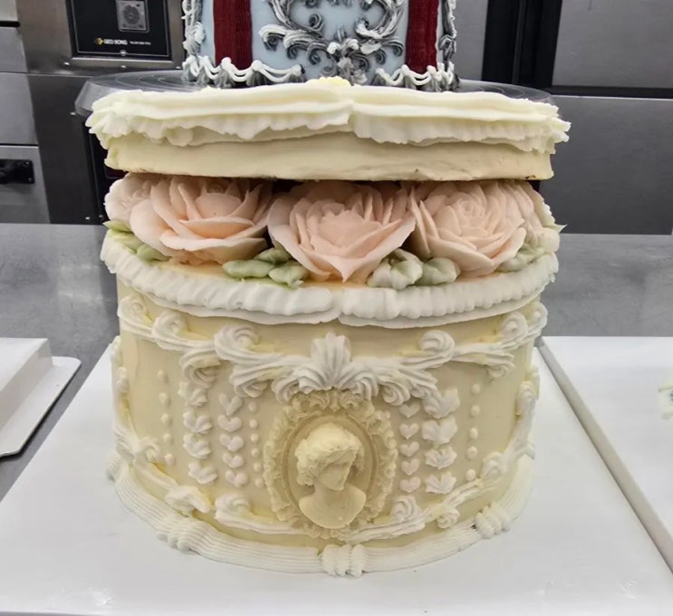 날로날로 수업시간의 강도가 높아지는시간.. 묵직한 파운드시트에.이탈리안머랭이용한 버터크림과 수제딸기쨈으로 샌드한 케이크랍니다 케이크 높이도 높아 아이싱도 힘들구.짜는 디자인도 많아 촉박촉박. 다들 여기저기 숨도 못쉬고.3일동안 연습하고 짜고 디자인잡고..이렇게 완성 했어요 윗면.옆면..장미까지..다들 또.멘붕 ㅋㅋ 색감 곱고 이쁘죠?..실물이 더 이쁜데 표현할길이 없네요 .저희학원 오셔서 직접 보시길 ㅎㅎ 언한 파랑색 들이느라.여러번 테스트. .또 테스트 .그리고 아이싱. 조색이 많이 힘들죠.ㅜㅜ 정말 노력많이 하셨어요. 원래는 더 이쁜 디자인이었는데.본인 마음에는 안든다는데. 저는 너무 고급져서 원픽이었어요.얼마....... <img src="https://blogthumb.pstatic.net/MjAyNjA0MjFfMjUx/MDAxNzc2NzgwNjk3MDg5.b7l6qQ0k0joPxvlsC6dkbX00MIAVu4PgOo6fON2RjUMg.lFHUK9KQ79Qv_gggzdD5hExtC2mt5DWpmyn_G6qM59Yg.JPEG/900_BandPhoto_2026_04_21_23_10_06_7.jpg?type=s3" />