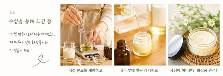 배움이 또 다른 배움을 부르다 천연화장품 원데이 클래스 수강생 후기 안녕하세요. 저의 천연화장품 원데이 클래스에 참여해주신 한 수강생분의 따뜻한 이야기를 소개해드리려고 해요. “생각보다 훨씬 좋았어요” 처음 방문하셨을 때는 “천연화장품은 어렵지 않을까요?” 조금은 조심스러운 마음으로 시작하셨어요. 하지만 수업이 진행될수록 직접 원료를 계량하고, 하나의 화장품이 완성되는 과정을 경험하시면서 “이렇게 직접 만들어보니까 너무 재미있고, 피부에 바르는 것도 더 믿음이 가요” 라고 말씀해주셨습니다. 천연화장품 원데이 클래스에서는 단순히 ‘만드는 체험’이 아니라 피부와 원료에 대한 이해까지 함께 전달드리고 있어....... <img src="https://blogthumb.pstatic.net/MjAyNjA0MjJfMTk0/MDAxNzc2ODY2NTQzMDM3.UqosPrlG6DFvSLLd-_rYs-o3udrfG1OMjdRjaduZeAgg.Wi1pg5fb3CfQXqDnrJEVNv7glValmij5XyIjxUsQvWMg.PNG/image.png?type=s3" />