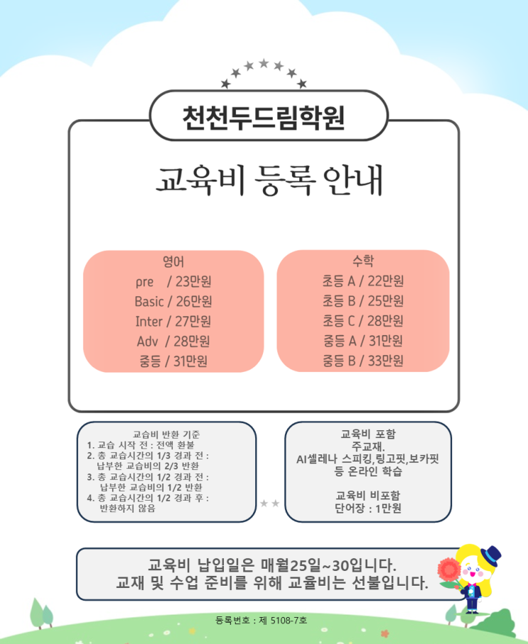 안안녕하세요. 꿈을 함께 키워가는 천천두드림학원입니다. 아이들의 하루하루가 차곡차곡 쌓여 실력이 되고, 그 과정이 즐거운 배움으로 이어지길 바라는 마음으로 2026년 학원 운영 일정을 안내드립니다. 학부모님들께서 미리 일정을 확인하시고, 가정에서도 아이들의 학습 리듬을 안정적으로 이어가실 수 있도록 준비하였습니다. 2026년 학원은 기본적으로 정규 수업을 중심으로 꾸준한 학습 흐름을 유지하되, 아이들의 재충전과 가족과의 시간을 충분히 고려하여 휴강 일정을 운영합니다. 무리하지 않으면서도 꾸준함을 놓치지 않는 것이 가장 중요하기 때문입니다. 주요 휴강 일정 - 법정공휴일 - 여름방학 : 7월 30일(목)~7월 31일(금) / 2일....... <img src="https://blogthumb.pstatic.net/MjAyNjA0MjBfMjAz/MDAxNzc2Njc0OTg1NDk4.0fteZ9fpFvOVRUp_UGaes9WYW1p0Rr345HeAmG0M45cg.Y9pc8tIl5YcjtrvS7ZZz6OdX3ktwAV2oLJvFvT2OxqAg.PNG/%B1%B3%C0%B0%BA%F1_%BE%C8%B3%BB.png?type=s3" />