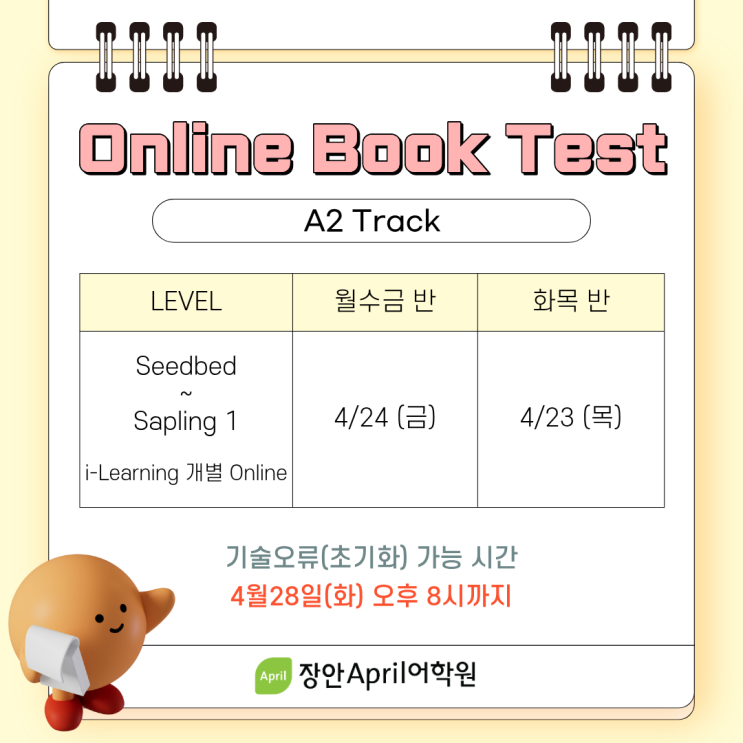 안녕하세요 수원장안 April어학원입니다. 다음주부터 A2 Track Online Book Test가 진행됩니다! 이번 테스트는 아이들이 그동안 학습한 내용을 얼마나 잘 이해하고 있는지 점검하고, 다음 단계 학습으로 나아가기 위한 중요한 과정입니다. 단순한 시험이 아니라, 아이들의 학습 방향을 점검하고 보완할 수 있는 기회이니 끝까지 최선을 다할 수 있도록 많은 응원 부탁드립니다 [Online Book Test 일정 안내] ✔ 대상 : Seedbed ~ Sapling 1 ✔ 일정 월수금반 : 4월 24일(금) 부터 화목반 : 4월 23일(목) 부터 ✔ 진행 방식 i-Learning을 통한 개별 Online Test 진행 ✔ 기술오류(초기화) 가능 시간 4월 28일(화) 오후 8시까....... <img src="https://blogthumb.pstatic.net/MjAyNjA0MTdfMjI5/MDAxNzc2NDAzNjIyODEw.sqI22WuxtcRS2rGfU7sdeT62GDpIzkfKppY3KH7dacYg.Nyg9fEt_iFHrYMuQUlL912uGj_3jpLl1MofBuuE9dP8g.PNG/1.png?type=s3" />