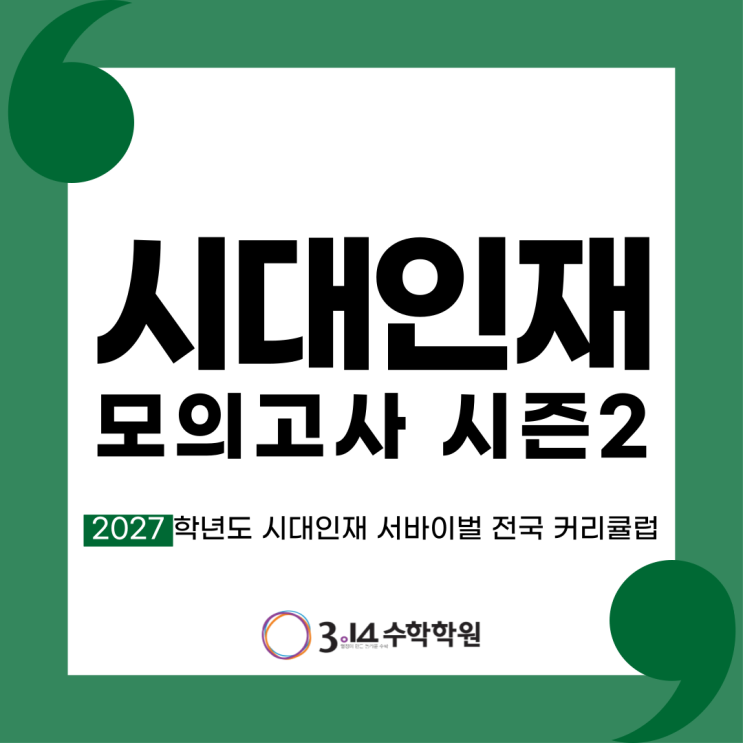 안녕하십니까, 3.14 고등수학 학원입니다. 저희 3.14에서는 고3 학생들에게 도움이 되고자 수능과 가장 비슷한 시대인재와 제휴하여 자료를 제공할 수 있게 되었습니다. 시대인재는 ✔ 최상위권 학생들이 선택하는 실전형 문제 퀄리티 ✔ 수능 출제 경향을 정밀하게 반영한 자료 구성 ✔ 변별력 있는 고난도 문항과 사고력 중심 문제 설계 로 이미 입시 시장에서 검증받은 브랜드입니다. 수능의 흐름은 매년 조금씩 달라지지만 상위권을 가르는 힘은 결국 ‘실전에서 흔들리지 않는 문제 해결력’입니다. 시대인재는 실제 수능과 가장 유사한 긴장감과 난이도를 바탕으로 실전 감각을 극대화하는 프로그램으로 잘 알려져 있습니다. 우리 3.14 재....... <img src="https://blogthumb.pstatic.net/MjAyNjA0MThfMTgg/MDAxNzc2NDc5MzQ0Njgy.LXGd34h5gPcIRs6APQR2nv1khik1eZTnzLEm3THZrlYg.Hz5eTFpOC9g5JMApkoOzjyV9dQqMyWfue0BNroYg7wkg.PNG/%C3%D6%C3%D6%C1%BE%BD%C3%B4%EB%C0%CE%C0%E7_%BA%B9%BB%E7%BA%BB-_2_-001.png?type=s3" />
