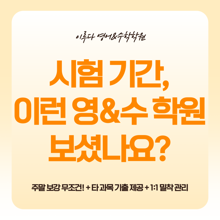 영어, 수학만 붙잡고 있다가 전 과목 다 놓치면 어쩌죠? 시험 기간, 학부모님들의 가장 큰 불안은 '공부의 불균형'입니다. 학원 숙제에 치여 정작 암기 과목은 책 한 번 못 펼쳐보고 시험장에 들어가는 아이들이 태반이기 때문입니다. "애는 밤늦게까지 고생하는데 왜 성적은 제자리일까?"라는 의문이 든다면, 그건 아이의 노력이 부족해서가 아닙니다. 학습의 우선순위와 밸런스를 잡아줄 조력자가 없어서입니다. 그래서 오늘 우리 아이의 내신을 완벽하게 방어하는 이루다 학원의 특별한 시험 기간 관리 전략을 공개합니다. ▶ 매번 제자리인 아이의 성적, '진짜 조력자'가 필요한 타이밍입니다. 이루다의 시험....... <img src="https://blogthumb.pstatic.net/MjAyNjA0MTRfMTk4/MDAxNzc2MTUzNDczMDk3.fBIhJjJDeAOCxvsRzuA6hPfCYLGtzNFKKEUyB4m7YyYg.csBYzM7NmsdAEuWsU9JnHqOQcBor91IEgxITCsoZZ20g.PNG/%C1%A6%B8%F1%C0%BB_%C0%D4%B7%C2%C7%D8%C1%D6%BC%BC%BF%E4..png?type=s3" />