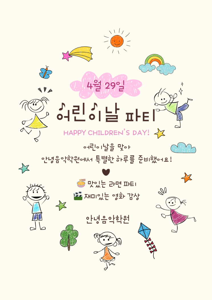 안녕음악학원 어린이날 파티 안내 어린이날을 맞아 우리 안녕 친구들을 위한 특별한 시간을 준비했어요 한 주 먼저! 다 같이 모여서 즐거운 어린이날 파티를 진행합니다 일정 4월 29일 (수) 오후 1시 ~ 6시 맛있는 라면도 함께 먹고 재미있는 영화도 보고 신나는 음악 게임까지! 아이들이 편하게 웃고 놀 수 있는 시간으로 즐겁게 준비하고 있어요 공휴일 전에 우리 안녕 친구들 모두모두 모여요! 행복한 추억 만들 수 있도록 잘 준비하겠습니다 ———————————————————————- 광교초·광교웰빙타운 피아노 전문 교육기관 안녕음악학원입니다. 아이들이 피아노와....... <img src="https://blogthumb.pstatic.net/MjAyNjA0MjZfMTU2/MDAxNzc3MjAyNzk4NjEx.bzGlx9ZQRRGU1Xxv7g1Ww_JF8CrS3lvLytRhaId1lngg.HBJ99-Te_dZaUCpqFHZ_riKQrqAlzlUrXaPZvvEdYxAg.PNG/IMG_3581.png?type=s3" />