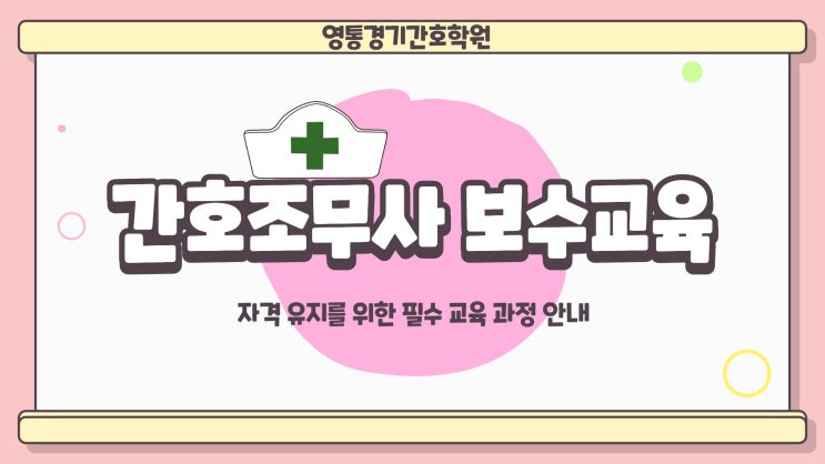 간호조무사 국가고시에 합격하신 여러분들 고생 많으셨고 축하 드립니다 이제 여러분들은 내년부터 간호조무사 보수교육이라는 것을 필수로 이수를 하셔야 합니다. 하지만 어렵지 않고 영통경기간호학원에서 설명 해 드릴테니 따라오세요 ^^ 간호조무사 보수교육이란 ? 간호조무사의 전문성 유지와 환자 안전을 위한 필수 교육 과정입니다. 의료법 제80조에 따라 간호조무사는 매년 보수교육을 이수해야 합니다. 보수교육 대상자는? 간호조무사 자격 보유자 자격 관련 업무 종사자 취업 여부 무관 적용 교육 이수 시기 및 주기는? 매년 8시간 이상 이수 정기 교육 기간 확인 3년마다 취업상황 신고 그래서 간호조무사 자격증 취득을 하신 여....... <img src="https://blogthumb.pstatic.net/MjAyNjA0MjlfNzAg/MDAxNzc3NDI3Njk1ODQ5.EYYMIcxAD1XUbBpW0EYO6IE5s0Gh1Wnn7e-VHib2qJEg.bbc5l5Pi8HdQau_PL6G6tuF61H9nb1kKqados3rsEtMg.JPEG/1.jpg?type=s3" />