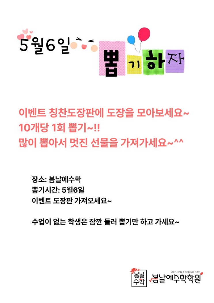공부도 하고, 선물도 받는 즐거운 기회! 안녕하세요 ~!! 봄날에수학학원입니다 다가오는 5월, 아이들의 학습 동기 부여를 위해 특별한 뽑기 이벤트를 준비했습니다! 어떤 이벤트인가요? 열심히 공부한 만큼 보상을 받는 즐거운 시간✨ 칭찬 도장판에 도장을 모으면 뽑기 기회가 생겨요! ✔ 도장 10개 = 뽑기 1회 ✔ 많이 모을수록 더 많은 기회! 푸짐한 선물 준비 완료! 아이들이 정말 좋아하는 선물들로 준비했어요 햄버거 세트 베스킨라빈스 아이스크림 상품권 ✏️ 다양한 문구류 꽝 없이! 즐겁게 참여할 수 있어요 이벤트 일정 이벤트 날짜: 5월 6일 장소: 봄날에수학학원 1관 ✔ 수업이 없....... <img src="https://blogthumb.pstatic.net/MjAyNjA0MTVfMjM0/MDAxNzc2MjQwOTg5Njgz.1uWZ5ZMhuw43D5sSu1U1GYrSS2cotNaBfNJxUkWEJ50g.Yqx_N6igi3bwguprXCIRY3BRDBwAvhTZG8zZCN1BPzQg.JPEG/%C1%A6%B8%F1%C0%BB_%C0%D4%B7%C2%C7%D8%C1%D6%BC%BC%BF%E4._%2818%29.jpg?type=s3" />