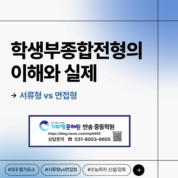 안녕하세요 기파랑문해원 반송중등학원입니다! 오늘은 2027 대입의 핵심 변화들 중 학생부 종합전형 대비 전략에 대해 알아보겠습니다 1. 서류형 VS 면접형 학생부 종합전형에는 크게 서류형과 면접형 두 종류로 나누어 볼 수 있는데요 먼저 서류형은 서류를 100%로 일관합산하여 최종 합격자를 선발하는 전형을 의미합니다. 면접의 부담 없이 학생부 서술만으로 당락을 결정합니다. 자기소개서도 폐ㅣ지되었기 때문에 이 전형에서는 학생부 서술의 중요성이 더욱 증가되고 있습니다 면접형은 서류형과 달리 단계별로 진행됩니다! 1단계에서는 서류만 100%로 평가하며 3~5배수 내외로 선발하고, 2단계에서는 서류와 면접을 병합하여 평가하게 됩....... <img src="https://blogthumb.pstatic.net/MjAyNjA0MjZfMTc0/MDAxNzc3MTgyOTYwNjYy.BAmtoxZXnOJnRB2mRL3L-ouKju3OMW1BeyoYolkBkhMg.ZA7pugJVznaFcDds4SWudlN89PyCjg8KxfFMnN9tvP4g.PNG/2.png?type=s3" />
