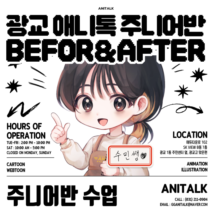 안녕하세요! 수원 광교 지역 애니메이션 교육의 중심, 애니톡 미술학원입니다. 오늘은 우리 아이들이 처음 학원 문을 두드렸을 때부터, 지금의 멋진 작품을 만들기까지 어떤 길을 걸어왔는지 그 발자취를 보여드리려 합니다. 중1 김O아 학생 작년 7월, 중학교 1학년이었던 O아는 인물화에 대한 남다른 애정을 품고 애니톡의 문을 두드렸습니다. 첫 수업 때 수줍게 그려냈던 BTS 정국 그림이 기억나네요. 애니톡은 O아의 명확한 관심사를 살려 '인물 소묘 및 드로잉 집중 커리큘럼'을 제안했습니다. 단순히 겉모습을 흉내 내는 것이 아니라, 얼굴의 구조와 드로잉 기초부터 탄탄히 쌓아 올리는 과정을 거쳤죠. 학업으로 바쁜 와중에도 주....... <img src="https://blogthumb.pstatic.net/MjAyNjA0MjRfMTc4/MDAxNzc3MDA0NjM5NjEx.dkPOBtps_q24lOvlqwKK-keNeRlR0_myEvJzPxf__oQg.41fYXEfPTGVHOXnRTR1DbamhY_ArCggTsJrYTwQKeHwg.PNG/%EB%B8%94%EB%A1%9C%EA%B7%3F_%3F%8D%B8%3F%84%AC_%285%29.png?type=s3" />
