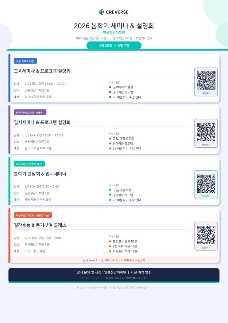 안녕하세요, 영통 청담어학원입니다! 교육 세미나, 프로그램 설명회 등 간담회 일정 공유드리니 많은 신청 바랍니다:) [영어 5대영역] No.1 영통 청담어학원 R/L/S/W + Grammar와 입시진학까지. <img src="https://blogthumb.pstatic.net/MjAyNjA0MjRfMjIw/MDAxNzc3MDA3MjA0OTY2.hGLZSd5tWrqWLAROaoYM_06eIZ603uHiQ4T2PL5MuD0g.4WN8vGWPWinzDuoGoIDpPzgdWNwCGWtLG9EwMwAcXmEg.JPEG/KakaoTalk_20260424_140323511.jpg?type=s3" />