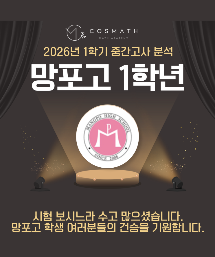 안녕하세요 코스매쓰 수학학원입니다. 아마 시험이 끝나자마자 후다닥 시험지를 풀어보고 바로 분석 자료를 블로그에 포스팅하는 것 같은데요. 바로 어제 망포고1학년 학생들의 1학기 수학 중간고사가 치뤄졌습니다. 사실 작년 중간고사에서 망포고 시험이 어렵게 출제되었기 때문에 이번 시험은 특히나 난이도 예측이 어려웠습니다. 타 학교에 비해 걱정도 긴장도 많았던 이번 망포고 시험! 과연 어떻게 출제되었을까요? 첫째도 둘째도 학교 프린트입니다. 이번 시험은 전반적으로 상당히 평이한 난이도로 예측이 되고 있습니다. 실제 대부분의 문항에서 상당히 평이하게 출제된 모습이며 다소 어렵게 느껴지는 문항 또한 전부 프린트에서 일부....... <img src="https://blogthumb.pstatic.net/MjAyNjA0MjRfMjc4/MDAxNzc3MDE0MjU5NjEy.LxGwgTrI9vxlGQLReWkqHXtETiTUCYAXUOsyOeFeL-Yg.6lPziXVG_e4M1fwxA3Z26pjYPqG0Qk_4w1DtAhckWMwg.PNG/%BA%ED%B7%CE%B1%D7-_-%B1%E2%C3%E2%BA%D0%BC%AE-010_%281%29.png?type=s3" />