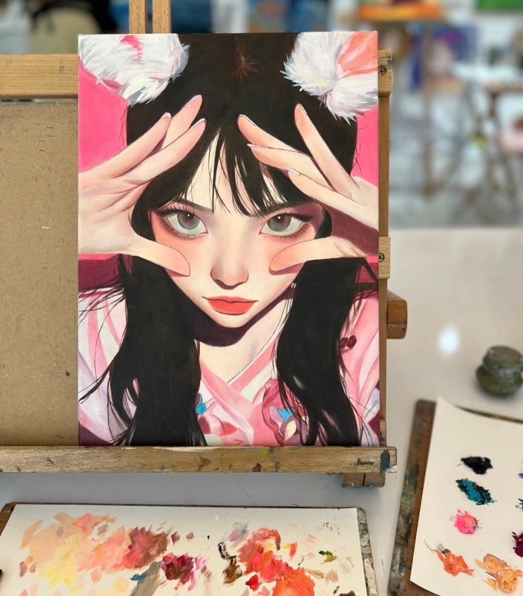 이건 확실히 캐릭터 표현 감각이 확 살아있는 작업이에요. 불어 전공 대학생 수강생님이 스케치부터 채색까지 했지요 눈, 손 포즈, 얼굴 중심 잡는 구도가 굉장히 안정적이고 시선 끄는 힘이 좋아요✨ 특히 눈 표현이 깔끔하게 잘 들어가 있어서 전체 완성도를 확 끌어올려줘요. 피부 톤도 핑크 계열로 정리하면서 과하게 번지지 않고 깨끗하게 잡은 게 좋고요 검은 머리랑 배경 핑크 대비도 아주 예쁘죠 색 자체는 단순한데 대비를 정확하게 써서 화면이 다채로운 느낌이에요. 손 디테일도 무너지지 않고 자연스럽게 이어진 점도 포인트입니다 전체적으로 캐릭터 작업에서 중요한 선명함과 부드러운 색 정리 가 잘 된 그림이죠....... <img src="https://blogthumb.pstatic.net/MjAyNjA0MjhfMTMy/MDAxNzc3MzQ2MjkxMDUz.daWIupFFLN7n9oTdUeoSRYjkmM7G8VhRSDWqqeGNHLYg.Ib8qKMIF6uIqNF_ubnqTUsmzTcdiCseMs0kIJLtC7gYg.JPEG/IMG%A3%DF8459.jpg?type=s3" />