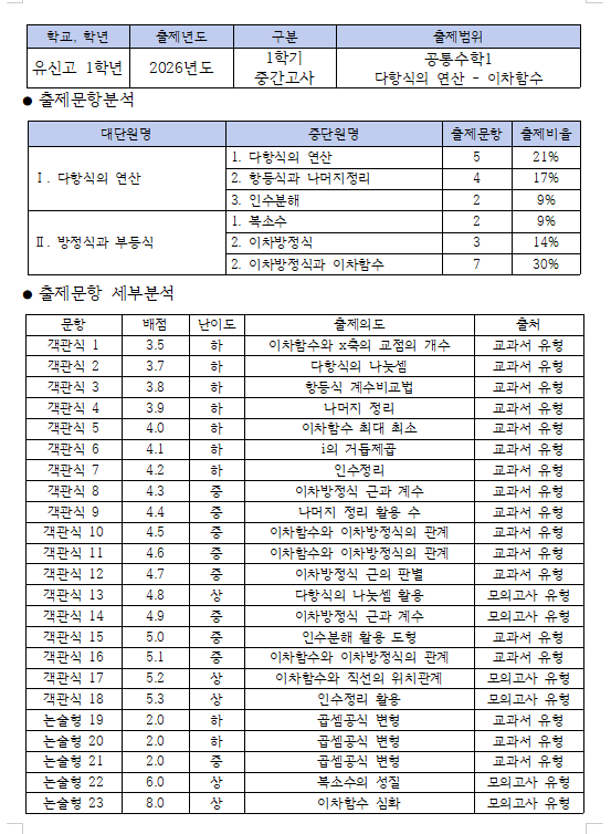 * 주요문항 및 최고난이도 문항 객관식 13번: 다항식의 구성 정확히 알고 있어야 하는 문제입니다. 객관식 17번: 이차함수와 직선의 위치관계를 묻는 문제입니다. 객관식 18번: 인수정리를 활용하여 식을 구성하는 문제입니다. 논술형 22번: i의 거듭제곱과 복소수의 성질을 묻는 문제입니다. 논술형 23번: 이차함수와 방정식을 모두 활용해야 하는 문제입니다. * 총평 전체적으로 함수와 방정식에 관한 문제가 많이 출제되었습니다. 고2, 고3때 필요한 필수적인 개념입니다. 이차함수와 이차방정식의 관계를 이해하고, 문제에서 주어지는 조건에 따라 응용할 수 있는 실력을 갖추어야 했던 시험이었습니다. 우선 10번에서 케이스를 나누는 문제....... <img src="https://blogthumb.pstatic.net/MjAyNjA0MjhfOTcg/MDAxNzc3MzYzOTg1NDM0.NTdLeNK-Tmd6H1AoZgVQe78LZ3HMECSUCgALWSZb3XEg.4qTmegKt3lfAB1XaOEFMm0ENqKUjT71FEwLSGXsT8zMg.PNG/image.png?type=s3" />