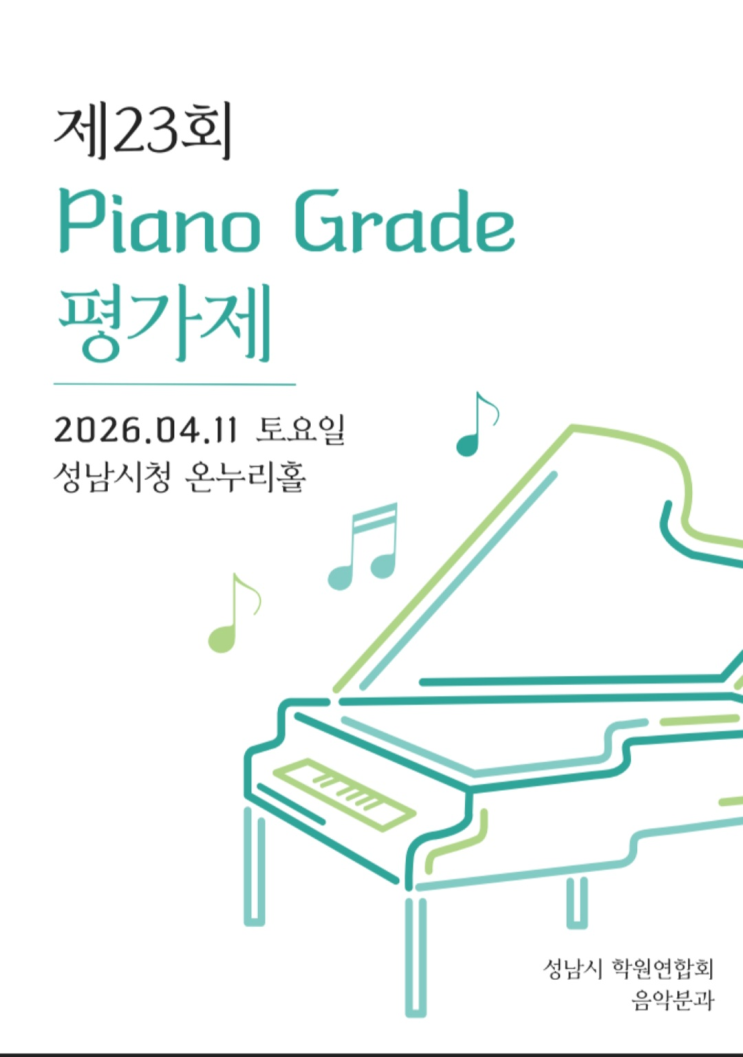 지난 2026년 4월 11일(토) 성남시청 온누리홀에서 진행된 제23회 Piano Grade 평가제에 태평동 예일음악학원 학생들이 참가하여 전원 합격이라는 좋은 결과를 얻었습니다 Piano Grade 평가제란? 연주 후 교수진에게 실기 평가를 받는 방식으로 무대 경험과 함께 실력 향상을 확인할 수 있는 평가입니다 단순 콩쿨과 달리 아이들이 현재 실력을 점검하고 다음 단계로 성장할 수 있는 의미 있는 과정입니다 합격자 명단 G-8급 연ㅇ영(수진초1) 이ㅇ은(성남서초1) 김ㅇ재(수진초2) 이ㅇ인(성남서초2) 장ㅇ진(수정초2) G-7급 윤ㅇ연(수진초2) 김ㅇ령(성수초3) 곽ㅇ원(성수초3) 류ㅇ혁(성수초3) G-6급 백ㅇ율(성수초3) 정ㅇ온(성남서초3) 나ㅇ서....... <img src="https://blogthumb.pstatic.net/MjAyNjA0MTVfNyAg/MDAxNzc2MjE1MzE2MjIy.OxtfxZM-jBHR-FPe7jzHpNFuLBSEvRBK52uu1pzEK18g.ivcK-5_EadAxCxlwgESLtWBgJo4VQRhUqRpgmgpvsiYg.PNG/image.png?type=s3" />