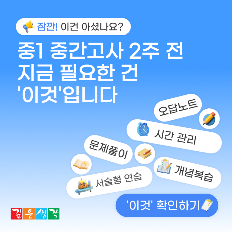 학부모님, 혹시 첫 중간고사를 본 그날, 기억 나시나요? 분명히 공부했는데 시험지를 받는 순간 머릿속이 하얘지던 그 느낌. 시간이 생각보다 빠르게 흘러서 뒷장을 아예 못 넘기던 경험. 아는 문제인데 왜인지 손이 멈추던 순간들. 그게 처음 시험을 보는 아이들이 지금 겪고 있는 일입니다. 학교에 따라 자유학기제를 시행하는 중1은 시험을 보지 않습니다. 틀려도 괜찮고, 등수도 없고, 평가는 과정 중심으로 이루어집니다. 그렇게 한 학기를 보낸 아이가 갑자기 실전에 투입됩니다. 풀 줄 아는 문제를 틀립니다. 시간이 모자라 뒤 문제를 못 풀고, 서술형에서 감점을 반복합니다. 실력의 문제가 아닙니다. 시험이라는 환경 자체가 처음이기 때....... <img src="https://blogthumb.pstatic.net/MjAyNjA0MjBfMTE4/MDAxNzc2NjU4MTY1NTY1.fRlHJm6elEi0BTecu3mS_VBm9oEG7jzat9vwW39kOKog.ldxDJUjxr8MPNS3blI9pVgAEtJ43xhNdTGlJeNkQQE8g.PNG/%C1%A6%B8%F1%C0%BB_%C0%D4%B7%C2%C7%D8%C1%D6%BC%BC%BF%E4._%2819%29.png?type=s3" />