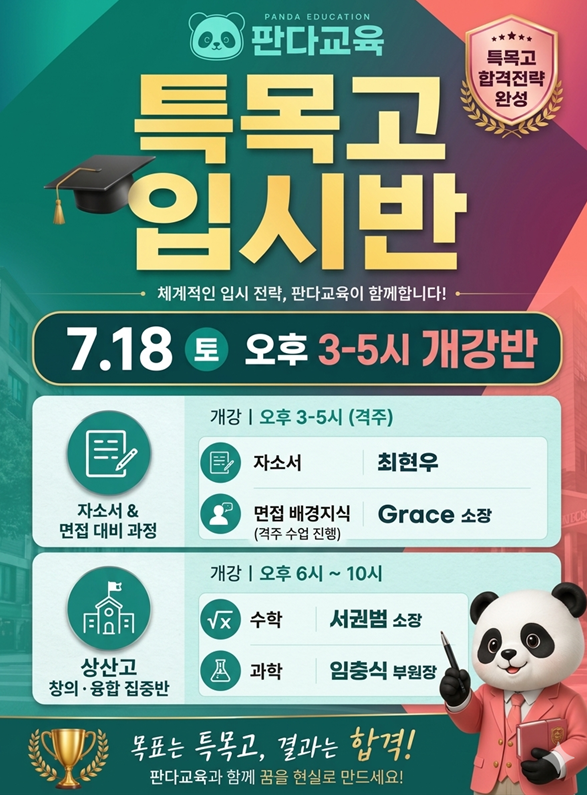 [2026 중2,3 특목고 설명회] _2027전형 - 선배들이 증명한 합격의 공식 - 6월 특목고 설명회 참석예약은? (온라인신청) 아래클릭! _ (특목입시반 수업은 마감임박!) https://forms.gle/qVXk1G32pibhffyd8 -수업관련 커리설명회는 6월10일 참석해주세요!~ 6월설명회 정보 (블로그) [특목고설명회] 2026 6월10일 오후1시-.. : 네이버블로그 (주)판다교육 입시팀 ㅣ 등록번호 제6092호 <img src="https://blogthumb.pstatic.net/MjAyNjA0MjlfMTgg/MDAxNzc3NDM3NjM0NDU0.0o6g3vyVWFs1uDRGZiVhiCrA6dXtbPhzoXkVHKGOcxgg.LcGsNSlwMMFkIu64Sgp5rjw54oFzddV5OY-cmxROIjkg.PNG/image.png?type=s3" />