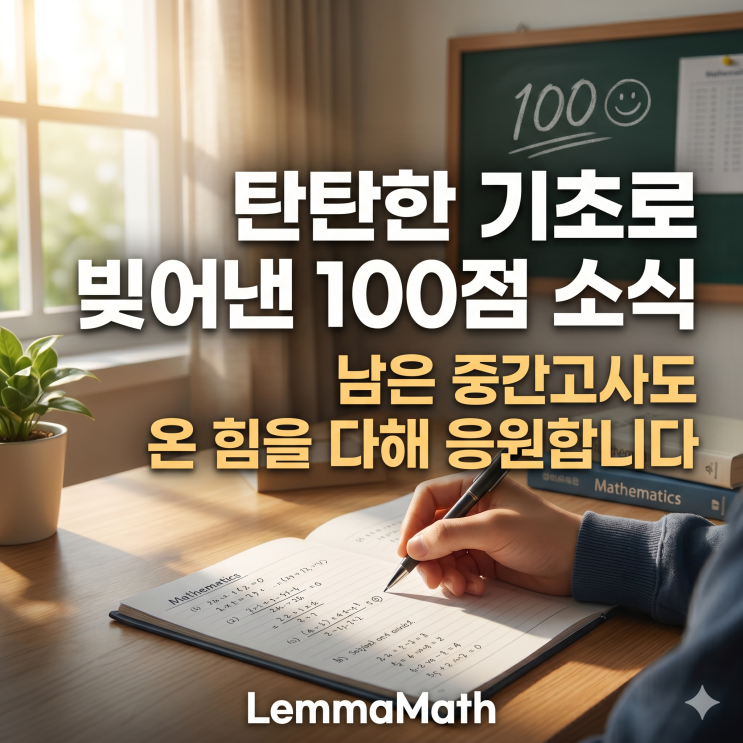 안녕하세요 렘마수학입니다. 본격적인 중간고사가 시작되었습니다. 오늘은 꾸준한 끈기가 만든 렘마수학 학생의 좋은 소식으로 시작합니다. 기분 좋은 중간고사의 시작 지난 수요일 경민비즈니스고의 시험으로 중간고사의 막이 올랐습니다. 긴장되는 첫 스타트였지만 기분 좋은 소식이 도착했네요. 2학년 기O서 학생의 수학 100점 소식입니다. 작년 2학기부터 인연을 맺고 부족한 부분을 함께 채워온 결과 렘마수학과 함께 무려 연속 세 번의 100점을 달성했습니다. 참으로 뿌듯한 순간입니다. 특성화고 수학도 결국 탄탄한 기초와 끈기 그동안 주로 일반고 아이들을 지도해 왔지만 가끔은 본인의 꿈을 위해 남다른 의지를 불태우는 특성화고 친....... <img src="https://blogthumb.pstatic.net/MjAyNjA0MjZfMTAg/MDAxNzc3MTc4NTEyNzQ5.ADWZ3q0KhobPopF8BhMjyLK_vQSsrx-7Wss7YxwebEYg.NZl-theeEaHnIODZZPvsOZdQgHt0vv6LVChIshk5aogg.PNG/Gemini_Generated_Image_xne0pdxne0pdxne0.png?type=s3" />