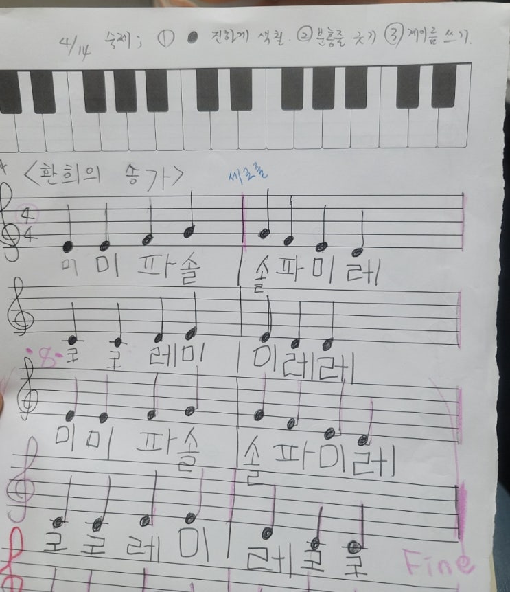 오늘은 일주일에 한 번씩 만나는 기초반 7세 유치부 아이의 숙제를 공개해 봅니다. 너무 귀엽고 잘했죠?^^ 현재 아이의 상황은 도부터 솔까지의 계이름 독보가 가능합니다. 숙제의 목적은 이에 덧붙여 음표의 확실한 인지, 그리고 마디 등 악보 체계에 익숙하게 되기 위함이에요. 숙제 한것을 보니 아이가 아직 4분음표,2분음표가 구분이 잘안되는것을 확인하였고, 이부분은 피아노를 치면서 점검하였습니다^^ 꼼꼼하게 잘 해온 점, 엄마도움 없이 스스로 한점 숙제를 하나도 빠짐없이 하려고 노력한 점을 많이 많이 칭찬합니다. ♡♡ 상담문의 031.855.4695. 010.2435.1822 #가능동유치부피아노 #의정부유치부피아노 #의정부7세피아노 #가능동7세....... <img src="https://blogthumb.pstatic.net/MjAyNjA0MjNfMTYx/MDAxNzc2OTA3NDI5NjQx._QEIEsL70Z6x3h4SZpEsZ_0V2dT3VkySh4LLcQlMtucg.6j6cC-EXAcnIkej-sN8jN9lc60edpV6eTjbQQd2EZvgg.JPEG/900_20260421_184450.jpg?type=s3" />