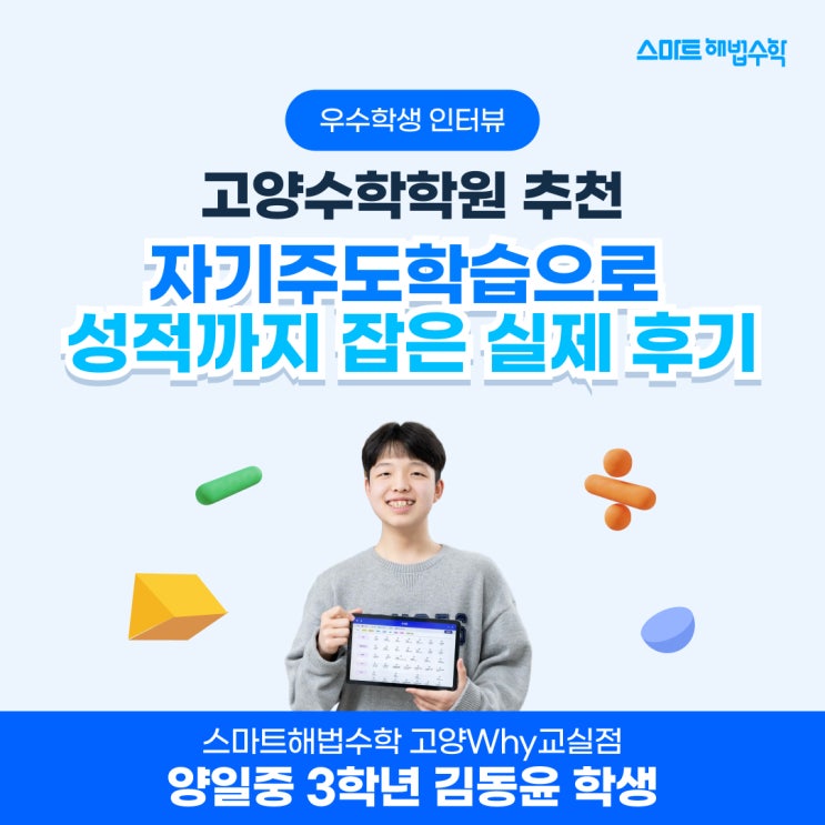 고양 양일중학교에 재학 중인 김동윤 학생은 광고·마케팅 분야에 관심이 많아 국제고 진학을 목표로 공부하고 있습니다. 다양한 사회 이슈와 트렌드를 배우기 위해 진로를 고민하던 동윤 학생은, 무엇보다 기초를 탄탄히 다지는 공부 방법이 중요하다고 생각하게 되었습니다. 이러한 고민 끝에 선택한 곳이 바로 고양수학학원 스마트해법수학 고양Why교실입니다. 대형학원이 아닌 ‘맞춤형 수업’을 선택한 이유 동윤 학생은 중학교 입학을 앞둔 겨울방학, 부모님과 함께 학원을 옮기기로 결정했습니다. 여러 학원을 알아보던 중, 기초를 체계적으로 잡아주는 학습 시스템을 기준으로 선택하게 되었고 Why교실에서 상담과 테스트를 진행했습니다....... <img src="https://blogthumb.pstatic.net/MjAyNjA0MzBfMTU0/MDAxNzc3NTM0MzQxMjgy.bYK9ujbJ4NYNaf6FQLK6v-joF90wsceA5fW7XfUJvMQg.H1fxwpEMRp1VqLt_l1DNgtoQ7DwU5O18bMX_6-et8Gog.JPEG/260128_%BD%BA%B8%B6%C6%AE%C7%D8%B9%FD%BC%F6%C7%D0%BF%EC%BC%F6%C7%D0%BB%FD_01%28%BA%ED%B7%CE%B1%D7%29.jpg?type=s3" />