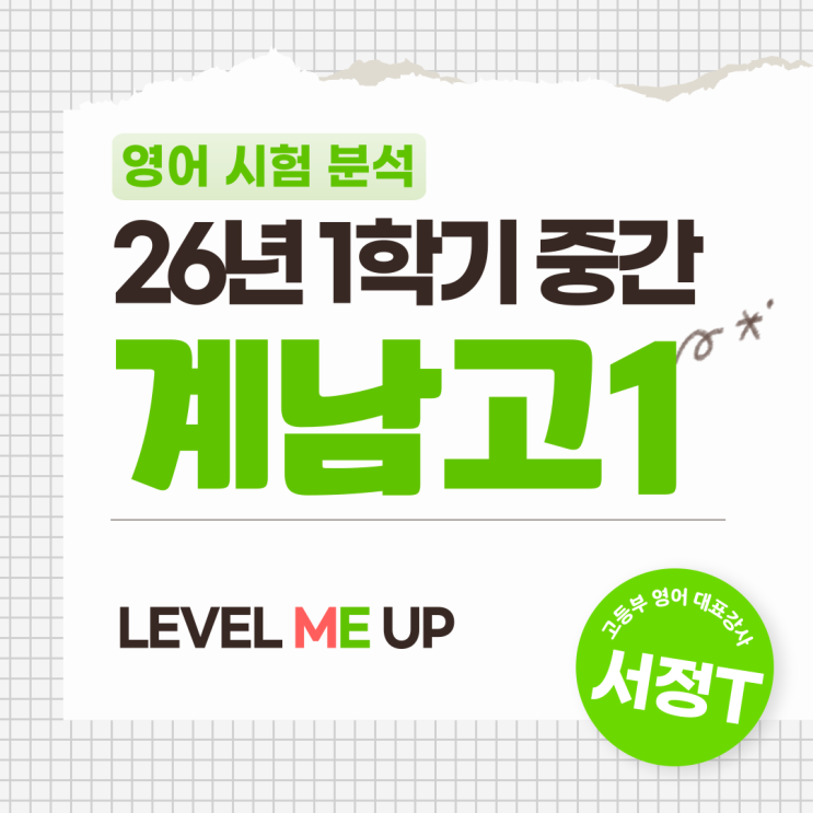 첫 시험, 점수보다 오답 유형/원인 파악에 집중할 것 안녕하세요 레벨미업학원입니다 이번 26학년도 1학기 계남고1 영어 시험 분석입니다 우리 친구들 고등학교 1학년 첫 시험이었죠^^ 혹시 시험이 어렵게 느껴졌나요? 아마 예상과 다른 시험결과에 놀라는 친구들이 많을거라고 생각합니다 1학년 첫 시험, 난이도 확인을 통해 이후 학습계획을 세워나가는 것이 중요한 타이밍입니다 이번 영어 시험에 대한 문항별 분석을 참고해보기를 바랍니다^^ 계남고1 26년 1학기 중간고사 (영어) 문항별 분석 레벨미업학원 고등부 영어 대표강사 서정T 계남고1 영어, 기존 기출 경향 그대로 이번 계남고1 영어 시험은 기존 기출 경향과 큰 차이 없이 출....... <img src="https://blogthumb.pstatic.net/MjAyNjA0MjNfMjM1/MDAxNzc2OTQwNzk2OTU0.WuZwwqFdePTS7ueGf3ASOJfcLFMF-S24N9SvNIHJsWUg.0AKW_b6XGLg5LuA5A8Z3kkDofIB6MmuRPZgxxuP63Hog.PNG/%BE%E7%BD%C4-%BD%C3%C7%E8%BA%D0%BC%AE-_%B0%ED%B5%EE-%BF%B5%BE%EE_-002_%2810%29.png?type=s3" />