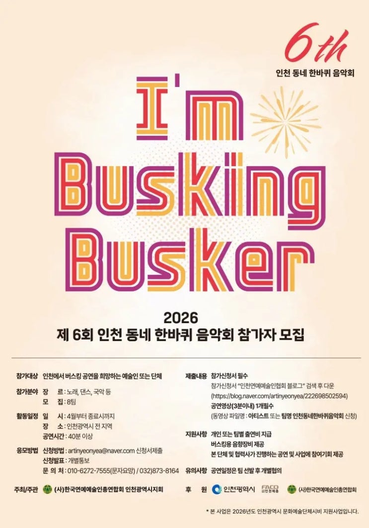 제6회 인천 동네한바퀴 음악회(Life with 수봉공원) 버스커(공연팀) 모집 제6회 인천 동네한바퀴 음악회 인천시민에게 일상 속 음악의 즐거움을 주인공 당신의 무대를 기다립니다! 재능과 끼를 가진 예술인 여러분을 찾습니다! 당신만의 감성과 에너지로 무대를 채워줄 예술인을 모집합니다. 주최/주관: (사)한국연예예술인총연합회인천연예예술인협회 개인 또는 팀별 출연비 30~100만원 지급예정 향후 단체에서 주최/주관하는 공연활동 우선 참가자격 부여 지원 방법 모집요강 및 포스터를 참고해주세요. 참여 신청서는 협회 공식 블로그에서 다운로드 가능 신청 시, 공연 영상 또는 링크, 연락처 필수 기재 및 첨부 이....... <img src="https://blogthumb.pstatic.net/MjAyNjA0MTZfMTUw/MDAxNzc2MzE0NjE2MjI0.b9II-nIgsC4IiCDgKD5lz5gzgLPYB2GjhkGxXjjx7vgg.THhAvzm8NQbKxU_dE4ywr3QcgqBT8SBe4756iNsafHMg.JPEG/mqd8QEf-N-c0.jpg?type=s3" />