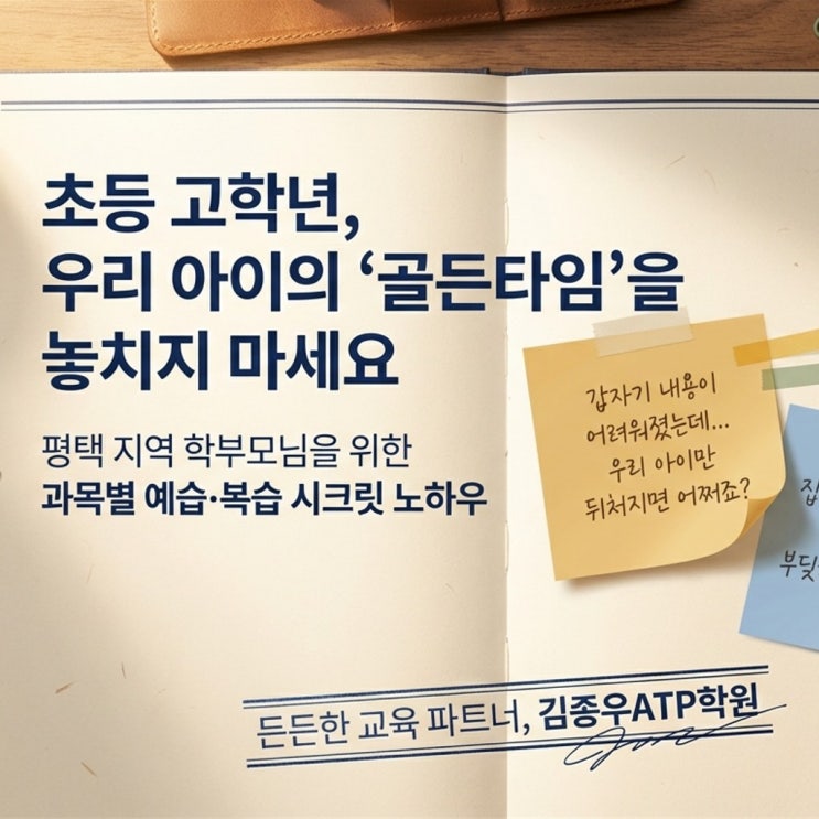 안녕하세요! 평택 지역 학부모님들의 든든한 교육 파트너, 김종우ATP학원입니다. 벚꽃이 완연한 2026년 4월, 벌써 1학기의 절반이 지나가고 있네요. 이 시기가 되면 특히 초등 고학년(4~6학년) 자녀를 둔 부모님들의 고민이 깊어집니다. "내용이 갑자기 어려워졌는데, 우리 아이만 뒤처지는 건 아닐까?" "집에서 복습을 시키려 해도 아이와 자꾸 부딪히기만 해요." 오늘은 이런 고민을 안고 계신 평택 맘들을 위해, 아이의 학습 자존감을 지켜주면서도 실력을 탄탄하게 쌓을 수 있는 '과목별 골든타임 예습·복습 노하우'를 공유해 드릴게요. 1. 왜 초등 고학년이 '학습 골든타임'일까요? 초등 고학년은....... <img src="https://blogthumb.pstatic.net/MjAyNjA0MTNfMjM1/MDAxNzc2MDg2ODY0NTE5.6NCoJiSYhCcwGP7m1t3fzHSdulxv3vZDkrUP5Dll1skg.sEBN5Q1D5qmcvln5KFRTbOierF_CsdwQ5RYklGjuvbQg.JPEG/Upper_Elementary_Golden_Time_Roadmap_1.jpg?type=s3" />