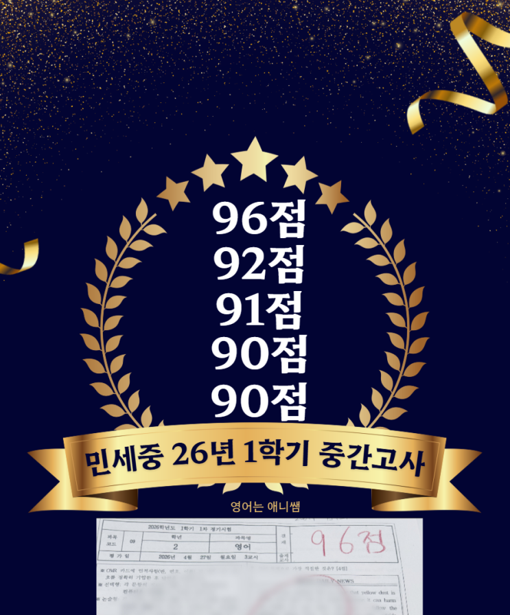 안녕하세요. 평택 고덕국제신도시 영어학원 애니쌤입니다 중등수업을 시작하고 한번도 A등급이 깨진 적이 없었어요 그만큼 학습 분위기가 좋다는 증거죠 2026년 1학기 중간고사 지필 결과를 공유합니다. 민세중 2~3학년 영어 성적표 96점 / 92점 / 91점 / 90점 / 90점... 이상 시험이 끝난 뒤, 아이들 성적표를 받아보는 순간은 저도 늘 긴장됩니다. 이번에도 아이들이 정말 잘해주었습니다❤️ 점수는 결과입니다. 그 결과를 만드는 것은 시험 기간의 분위기라고 생각합니다. 애니쌤 중등반 아이들은 시험 기간에 서로 긍정적인 자극을 주고받습니다. 누가 몇 점을 맞았는지 비교하는 분위기가 아니라, 다 같이 준비하고 다 같이 잘 보자는....... <img src="https://blogthumb.pstatic.net/MjAyNjA0MjhfMjkx/MDAxNzc3MzgyMTc5MDk3.m_UCd99yFqJ8_sgeKLouvkkai624Zb50n9PGuYmRj_Ug.38YLyd4SKBBOfz_cAfA4gCOQEKOmDQTveAZq_ix6KL4g.PNG/image.png?type=s3" />
