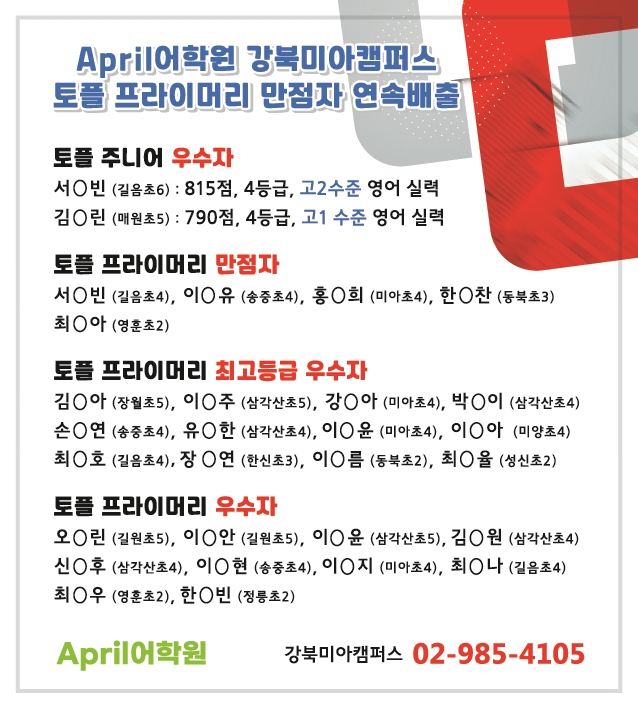 [에이프릴어학원 강북미아캠퍼스]2026 토플주니어/토플프라이머리 우수자