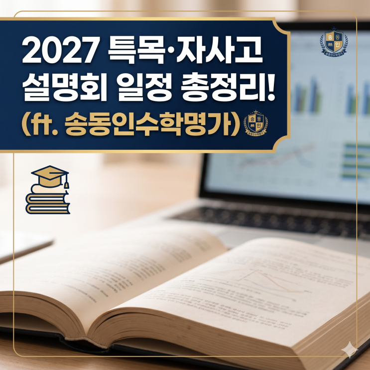 [제목] 2027 특목·자사고 입시 개막! 설명회 일정 총정리 (ft. 송동인수학명가) 안녕하세요! 송동인수학명가학원입니다. 지난 14일, 교육 전문 매체 '베리타스알파'를 통해 2027학년도 특목·자사고 입학설명회 일정이 공개되었습니다! 특목고와 자사고 진학을 꿈꾸는 학생들에게 5월은 '정보력'이 실력이 되는 매우 중요한 시기인데요. 우리 학부모님들을 위해 핵심 일정을 정리해 드리고, 변화하는 입시 속에서 수학 1등급 전략까지 공유합니다! 1. 2027 특목·자사고 입학설명회 일정 (5월) 인기 고교 설명회는 예약 시작 '1분 컷'인 거 아시죠? 미리 체크하고 알람 설정 필수입니다! ⏰ 전....... <img src="https://blogthumb.pstatic.net/MjAyNjA0MjBfMTA2/MDAxNzc2NjY5MDUwOTMz.JbOeUhLaByCCItX6Gtqn0NbqiDQeORVqWvUj9jVJbNcg.kex22UWG1bQA0b92xLFQHQfWeeePtGlL4cR2uXw6VVQg.PNG/Gemini_Generated_Image_j8v9y3j8v9y3j8v9.png?type=s3" />
