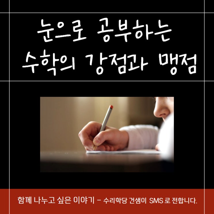 눈으로 공부하는 수학의 강점과 맹점 수학 문제를 눈으로 푸는 전략은 효율적이다. 시간을 많이 절약할 수 있기도 하고... 이미 한 번 본 책을 깨끗한 상태로 눈으로 보면서 느낌표가 붙도록 하는 것이 공부의 정수이기 때문이다. 실력이 향상될수록 그 효율은 극대화된다. 하지만... 매우 주의할 것은 눈으로 푸는 전략과 그 계산 과정이 명확할 때... 라는 전제 조건하에서 인 것이다. 무슨 이야기이냐 하면... 눈으로 보고 푸는 전략과 계산의 흐름이 명확한 것에 한해서 눈으로 풀어야 한다는 것이다. 개략적인 추정에 의한 풀이 전략이 섰다고 건너뛰다가는 본시험에서 크게 망하는 경우가 발생한다. 그렇게 되는 결정적 이유는 매우 긴장되....... <img src="https://blogthumb.pstatic.net/MjAyNjA0MjlfMjk0/MDAxNzc3NDQxNDU0NTUz.FIc6rmkJIhRqIo2HQ_-gX3auyi1tm47_FfnopY9E7_wg.Osx-UjV0swIua7JB30_ugt2jqJRNythOxbdoKK2OOrQg.JPEG/%B9%E8%B3%CA%B4%AB%C0%B8%B7%CE_%B0%F8%BA%CE%C7%CF%B4%C2_%BC%F6%C7%D0%C0%C7_%B0%AD%C1%A1%B0%FA_%B8%CD%C1%A1_1.jpg?type=s3" />