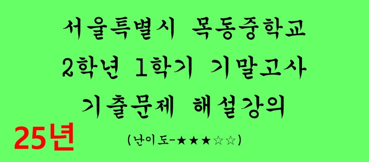 2026학년도 1학기 기말고사 시험대비 중학교 2학년 1학기 기말고사 기출문제 해설강의입니다. 서울특별시에 있는 목동중학교 2025학년도 기출문제입니다. 시험범위는 방정식과 부등식, 일차함수 입니다. 난이도는 중으로 평이합니다. 주어진 식을 연립해서 x , y 를 구한 뒤 다시 대입해서 a 와 b 를 찾습니다. 평균을 구하는 문제입니다. 총점을 각각 찾아 더한 뒤 전체 학생수로 나눠서 계산합니다. 일차함수에 관한 문제입니다. 기울기 구하는 방법 기울기의 부호와 그래프의 모양 y 절편 x 절편 등등 일차함수에 대해서 자세하게 물어보기 때문에 하나라도 빠짐없이 전부 잘 알아둬야합니다. 두 일차함수 두 직선의 위치관계는 평행하다. 한....... <img src="https://blogthumb.pstatic.net/MjAyNjA0MzBfMTY4/MDAxNzc3NTI0MjY3NTYz.EDFHqieXCZbTGQdr6i5__p4A4ZVAv3VUl0QYBgV6CRkg.yw8hy94WXJKjO8u1aZCMjOqiVQNuPE6tiKlxjkjM8aUg.JPEG/1380.jpg?type=s3" />