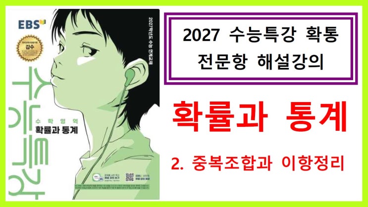 2027 수능특강 확률과통계 문제 풀이입니다. 손글씨 문제풀이입니다. 2. 중복조합과 이항정리 전문항 손풀이 해설입니다. 중복조합 H 를 C 로 바꿔서 계산합니다. 같은 볼펜을 중복해서 나눠주므로 중복조합 H 를 사용합니다. 각 상자에 흰 공 1개씩 먼저 넣은후 중복조합 H 를 사용합니다. ab 의 곱이 6 이 되는 수부터 찾은 뒤 자연수이므로 음이아닌정수로 바꾼뒤, 중복조합 H 를 이용하여 계산합니다. 함수의 개수 문제입니다. 증가하는 증가함수인데 등호가 있으므로 중복조합 H 를 사용해서 계산합니다. 다항식의 전개식에서 서로 다른 항의 개수는 중복조합 H 를 사용해서 계산합니다. 이항정리를 통해서 계수를 구할 수 있습니다. 이항정....... <img src="https://blogthumb.pstatic.net/MjAyNjA0MjhfMTgw/MDAxNzc3MzYwNDE2MTA1.8Lg_LMwFIZzLYcLdBdu8hvx2QclRCpypfxKq3Y9wFMsg.oZdJYwQTFTMbilW4B1zp5UYsTIW8Iy-wSJ4hsngIBlAg.JPEG/%C8%AE%C5%EB_2._%C1%DF%BA%B9%C1%B6%C7%D5%B0%FA_%C0%CC%C7%D7%C1%A4%B8%AE.jpg?type=s3" />