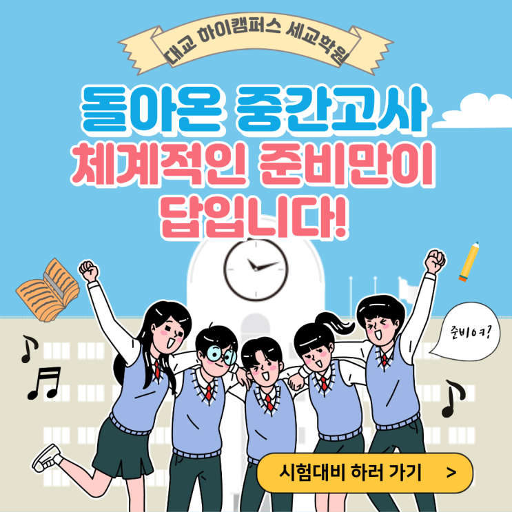 안녕하세요, 세교하이캠퍼스입니다 이번 주부터 본격적인 시험 기간이 시작되면서, 현재 내신대비 집중반이 활발하게 운영 중입니다! 학생들은 학교별 시험 범위에 맞춰 ✔️ 핵심 개념 총정리 ✔️ 예상 기출문제 풀이 ✔️ 오답 보완 및 취약 파트 집중 관리 를 중심으로 실전 대비에 들어갔습니다. 특히 시험 직전인 만큼, 단순한 문제풀이가 아닌 점수로 이어지는 학습에 집중하여 마무리까지 꼼꼼하게 지도하고 있습니다. 현재 진행 내용 과목별 핵심 포인트 최종 정리 실전형 문제 풀이 및 시간 관리 훈련 1:1 오답 피드백 및 보완 학습 학생별 취약 단원 집중 케어 시험은 준비한 만큼 결과로 이어집니다. 세교하이캠퍼스에서는....... <img src="https://blogthumb.pstatic.net/MjAyNjA0MjFfMjAx/MDAxNzc2NzUyNTk3MjE0.o7eXgLMf0FXbfRdJQQtssqpsbjfd2kKzYZT7k5SFkMMg.F07WvyBbGlOWGq8yRzF9CV5DrDOw98CY1LA8BUu3Fi4g.PNG/%C1%A6%B8%F1%C0%BB_%C0%D4%B7%C2%C7%D8%C1%D6%BC%BC%BF%E4._%286%29.png?type=s3" />