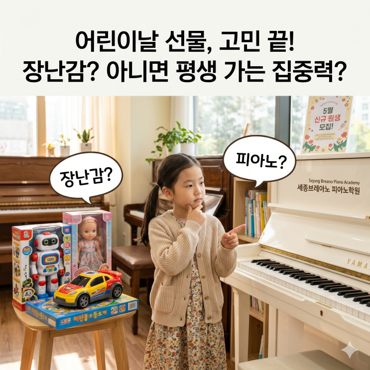 안녕하세요, 세종브레아노 피아노학원입니다. 가정의 달 5월이 다가오고 있습니다. 우리 아이를 위한 어린이날 선물, 올해는 어떤 것을 준비하고 계신가요? 매년 이맘때가 되면 유행하는 장난감이나 전자기기를 고민하시는 학부모님들이 많습니다. 하지만 아이들의 흥미는 금방 식어버리고, 결국 집안 한구석에 방치되는 경우가 대부분입니다. 올해는 며칠이면 흥미가 떨어지는 물건 대신, 아이의 평생 학습 태도를 좌우할 귀한 자산을 선물해 보는 것은 어떨까요? 바로 평생 가는 집중력과 두뇌의 인지 성장입니다. 오늘 세종브레아노에서는 뇌 과학의 관점에서 음악 교육이 아이들에게 왜 최고의 선물이 될 수 있는지 자세히 안내해 드리겠습니....... <img src="https://blogthumb.pstatic.net/MjAyNjA0MjlfMTUy/MDAxNzc3NDU3MjIxNjkw.vkMu4O0HFPf2PX0lIymrox3YNxprcqRNJL59vVb1_dQg.FLPbo4S2t2mgK0GWauoYNg1NUQjiopHtbX-5aLX2GZ4g.PNG/Gemini_Generated_Image_l9evtol9evtol9ev.png?type=s3" />