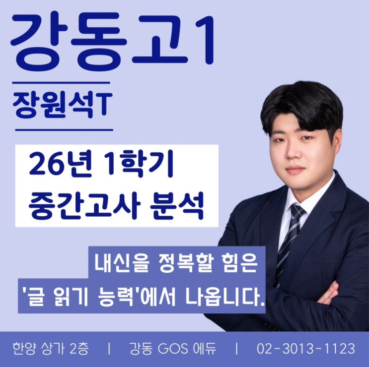 안녕하십니까. 강동 고스에듀 국어과에서 강동고를 담당하고 있는 장원석T입니다. 오늘 마무리된 강동고1 중간고사에 대해 분석하겠습니다! (저작권 문제로 인하여 시험 문제는 업로드가 어려운점 양해부탁드립니다) 강동고 1학년 국어 중간고사 분석: 총평 26년 강동고 1학년 국어 중간고사는 다음과 같은 문항으로 구성되었습니다. 현대시 : 객관식 6문항 / 서술형 1문항 현대 소설 : 객관식 4문항 / 서술형 1문항 음운의 변동 : 객관식 8문항 / 서술형 1문항 대화의 원리 : 객관식 2문항 / 서술형 1문항 = 총 24문항 출제 전체 난이도 : [하 / 중 / 중상 / 상 / 최상] 이번 시험은 ‘외부 랜덤 지문은 없을 것, 쉽게 출제될 것’ 이라는....... <img src="https://blogthumb.pstatic.net/MjAyNjA0MjRfMTM1/MDAxNzc3MDM1NzY5Nzk3.d5jqPU2mi_8dhSNu-dVPaFjv_4NjzIR4dWQhRJr3ftog.DHH_iGddUinFExOY1KZbPyWjeFE6hLYBkomo38Jmn5Mg.JPEG/IMG%A3%DF0914.jpg?type=s3" />