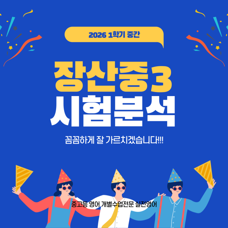 안녕하세요 실전학부모님들~ 기다리시던 2026년 1학기 중간시험 장산중 영어 3학년시험 분석자료 올려드립니다. 장산중 3 시험범위 장산중 영어 시험은 동아 윤정미 출판사 1~2과 학교 학습지 35장 내외 였습니다. 다른 학교에 비해 학습지 양이 많아 당황했네요. 문항별 분석 장산중 영어 3학년 시험은 총 6장 29문항이 출제 되었으며 문법과 작문 비중이 높은 편이었습니다. 아이들이 많이 당황했네요. 보기단어에 시험범위 내 단어가 아닌 중3 수준의 필수단어들이 출제되어서 장산중 영어 시험범위 내용을 알아도 보기 단어를 모를경우 틀릴수 밖에 없는 문제들이 출제되었습니다. 단어공부를 더더더 많이 시켜야겠습니다. 영역별 분석 장산....... <img src="https://blogthumb.pstatic.net/MjAyNjA0MjlfMTg1/MDAxNzc3NDQwOTc4ODE2._OpFkeayauE1mg8ZzWUuVXH1nq1hlA0A3zc7IEoO6OUg.Lp2iwlpt0sv8qbqNY07MnHZcXSzcZw20xWpvZD7MXGUg.PNG/%C1%A6%B8%F1%C0%BB-%C0%D4%B7%C2%C7%D8%C1%D6%BC%BC%BF%E4_-001_%2864%29.png?type=s3" />