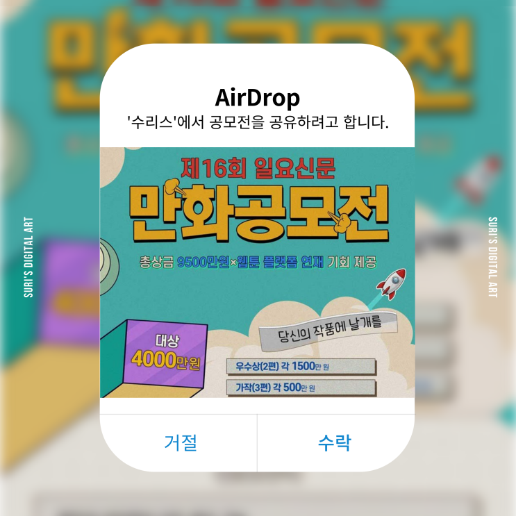 안녕하세요, 수리스의 밍니입니다 :) 오늘 소개할 공모전은 '제16회 일요신문 만화공모전'입니다! 지난해 대상 수상작 불발에 따른 이월 상금이 포함되면서 올해 공모전은 상금 규모도 대폭 커졌다고 합니다. 상금뿐만 아니라 웹툰 플랫폼 연재 기회까지 제공되는 이번 공모전을 잘 준비하신다면 작가분들에게 정말 좋은 기회가 될 듯 하네요 시상내역 - 대상 : 4000만원 - 우수상(2편) : 각 1500만원 - 가작(3편) : 각 500만원 - 결선 진출 지원금(10인) : 각 100만원 응모자격 - 현직과 아마추어 모두 응모 가능 - 타 공모전 출품작도 응모 가능(단, 수상작은 제외) - 공개된 작품도 응모 가능(단, 판권 계약된 작품은 제외) 응....... <img src="https://blogthumb.pstatic.net/MjAyNjA0MjZfMTU5/MDAxNzc3MTg5MTc4MDU3.voSOT_zpOQWqCqSXZcIApg8NdKlLVQ7AulyVjXyaWMAg.6s6TYUfDSbawSUPF4s078l6W1vL8TpCPCImFtPIeHh8g.PNG/%B0%F8%B8%F0%C0%FC-001_%2848%29.png?type=s3" />