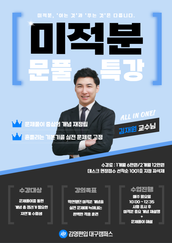 [대구편입수학] 미적분, 아는 것과 푸는 것은 다릅니다! 김재원 교수님 문풀 특강 안내 | 김영편입 대구캠퍼스