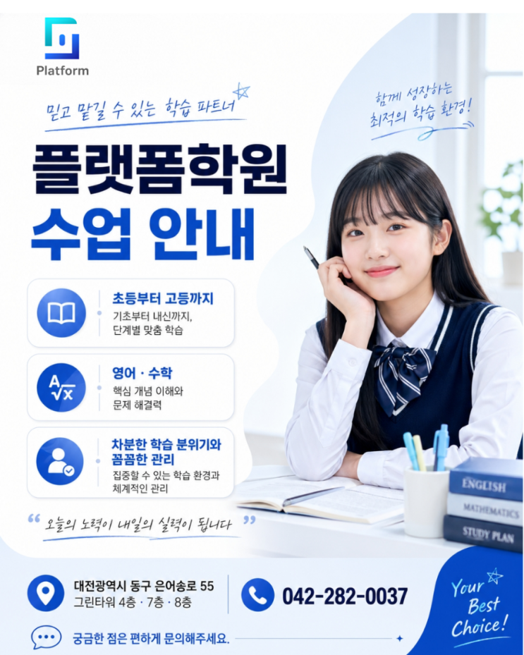 가오동에서 영어·수학 학원을 알아보실 때 가장 많이 고민하시는 부분은 “우리 아이에게 맞는 공부 흐름을 잡아줄 수 있을까?”일 것입니다. 플랫폼학원은 대전 동구 가오동에서 초등부터 중등, 고등 학생들까지 영어와 수학 수업을 진행하고 있습니다. 단순히 문제를 많이 푸는 방식보다는 아이가 개념을 이해하고, 풀이 과정을 스스로 정리할 수 있도록 수업을 이어가고 있습니다. 영어 수학 뿐만 아니라 전과목 수업을 진행중 국어 과학 등 공부는 오래 앉아 있는 시간만으로 만들어지지 않습니다. 중요한 것은 지금 아이가 어디에서 막히는지, 어떤 개념이 부족한지, 그리고 그 부분을 어떻게 다시 잡아가느냐입니다. 저희 플랫폼학원은 기....... <img src="https://blogthumb.pstatic.net/MjAyNjA0MjdfMTk1/MDAxNzc3MjgzNDU1MjIx.Qsvn5llaoXsdZYAXV0e77g6llbdHdfuvItvfky3NIaEg.4DKBoKQToNWaARJkIgUuQNvFdIzUwuV_nzkGjQP9Rjog.PNG/900_1777283193595.png?type=s3" />