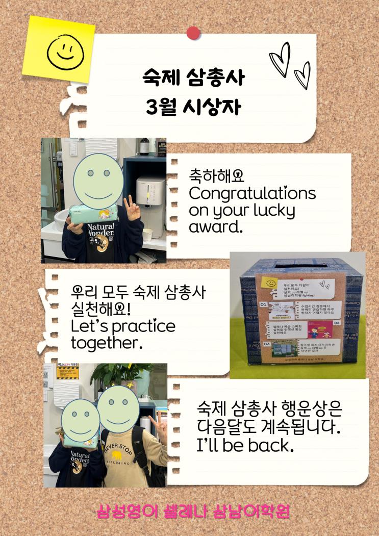 숙제삼총사를 열심히 한 덕분에 실력UP, 레벨UP을 할 수 있었네요. 이번 달도 숙제삼총사를 잘 해준 친구들에게 축하와 감사의 인사를 드려요~~^^ <img src="https://blogthumb.pstatic.net/MjAyNjA0MjNfMTIx/MDAxNzc2OTM0MzAyODk2.TeOwa5HwGfNlMYtezm10SPoRK1x5HBPRnPlHsgVQCzYg.0OBJfOLD5o6XZu43wwuI5FAL-oA1HIeoIx1-VpBUMacg.PNG/%BC%F7%C1%A6%BB%EF%C3%D1%BB%E7_3%BD%C3%BB%F3.png?type=s3" />