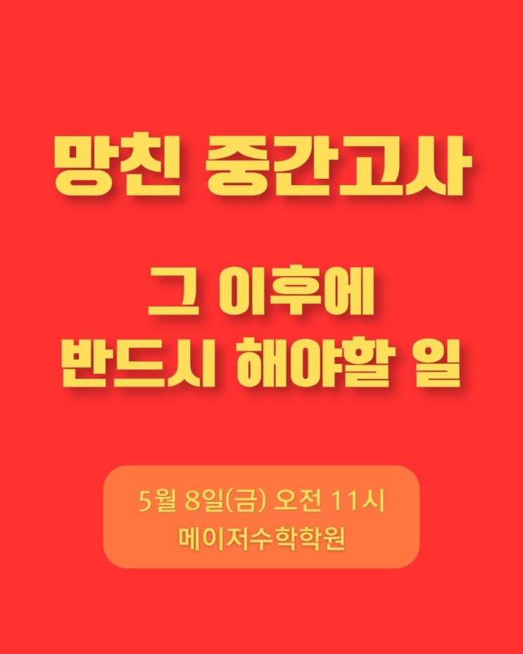 안녕하세요 메이저수학학원 홍인철 원장입니다. 중간고사가 한창입니다. 시험을 잘 본 학생도 있고, 생각보다 안 나온 학생도 있습니다. 지금의 시험 점수도 중요하겠지만, 시험 점수 그 자체보다 그 이후의 마음가짐과 계획이 더욱 중요합니다. 망친 이유에 따라 어떻게 공부 방법, 계획을 세워야 하는지, 또는 잘 보았더라도 좀 더 공부량을 늘리려면 어떻게 계획을 세워야 하는지, 결과가 어떻더라도 공부량을 압도적으로 늘려가는 학생이 결국에는 성공합니다. 그래서 시험 이후에 반드시 해야 할 일에 대해서 논의하는 시간을 가지려 합니다. 또한 중간고사 시험지로 개별 상담도 가능하오니 설명회 이후에 상담을 신청해주시면 제가 직접 성....... <img src="https://blogthumb.pstatic.net/MjAyNjA0MjhfMjA2/MDAxNzc3MzU4Nzc2MDc4.oxXXhZasX3IqXgxjtKqKI2RwIZUkLwSdFS2LeBst4Rgg.yXnziQWPxSW3STkB6pTvMS8uVfoccBKbHEeuTlrb0hwg.JPEG/0508_%B8%C1%C4%A3_%C1%DF%B0%A3%B0%ED%BB%E7.jpg?type=s3" />