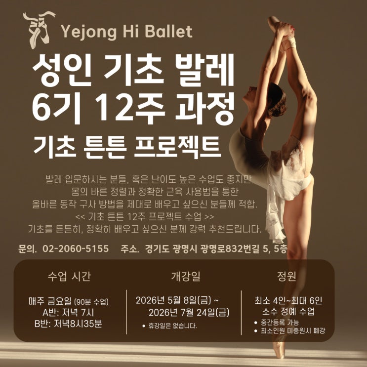 안녕하세요^^ 예종하이발레학원입니다. 많이들 기다려주고 계신 수업, 바로 성인 기초 과정 수업!! 26년 4월까지 5기 수업을 마무리하고, 26년 5월 시작반이 새롭게 개강합니다. << 6기 성인발레 기초 12주 과정 >> 전공생들에게 적용되는 교수법인 바가노바 메소드를 성인반 수업에도 그대로 적용시켜 그냥 땀만 흘리는 운동이 아닌, 보다 전문적이고 정확한 내용으로 진행되는 아주 귀한 수업입니다. 바가노바 메소드 자격증을 이수하신 선생님께 직접 지도 받는 아주 특별한 성인발레수업!! 성인 발레 기초 12주 과정, 90분 수업 발레를 처음 접하는 분들은 물론, 난이도 높은 수업도 좋지만 몸의 바른 정렬과 정확한 근....... <img src="https://blogthumb.pstatic.net/MjAyNjA0MTVfNDEg/MDAxNzc2MjQzNTAxNzI3.2lyf6LUDtpi2a9T2Fr2CStdkuf8cCj7pFdemqY8sii4g.f84clpEXvL_kV11_leT5ynXxE66Pgb8innYGKymwSH8g.JPEG/6%B1%E2_%BC%BA%C0%CE%B1%E2%C3%CA12%C1%D6.jpg?type=s3" />