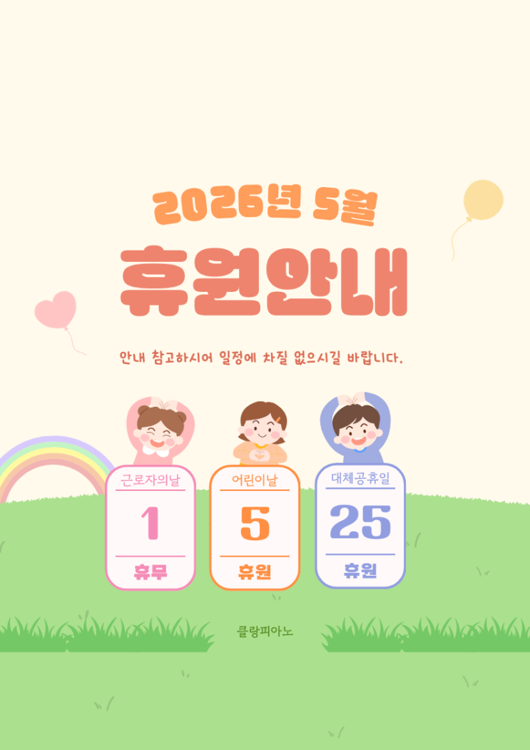 안녕하세요 클랑피아노입니다. 다가오는 5월 1일, 5일, 25일은 공휴일로 인한 휴원이며 일정에 차질 없으시길 바랍니다. 모두 따뜻하고 행복한 가정의 달 되시길 바랍니다 광명 상우2차아파트 상가동 2층 클랑피아노교습소 운영시간 13:00-19:00 ☎️교육문의 010.2518.8012 ㅡ #클랑피아노교습소 #광문초피아노 #광문중피아노 #광명음악학원 #광명피아노학원 #광명동피아노학원 #광명피아노레슨 #광명피아노입시 #광명7동피아노 #광명피아노교습소 #광명푸르지오센트베르아파트피아노 #광명아크포레자이위브아파트피아노 #광명중앙하이츠아파트피아노 #광명상우아파트피아노 #광명푸르지오센트베르아파트학원 #광명아크포레자이위브....... <img src="https://blogthumb.pstatic.net/MjAyNjA0MjRfMTI0/MDAxNzc3MDIyNDEyNTc4.uy_vpKPQhveFmECa8QDebwjS1q37zFzzYGVmzzu1k4Mg.Sqkiker8_WDJ-3VZigps9T-alxbLM8_-KASFcR_IcSYg.PNG/IMG%A3%DF1655.PNG?type=s3" />