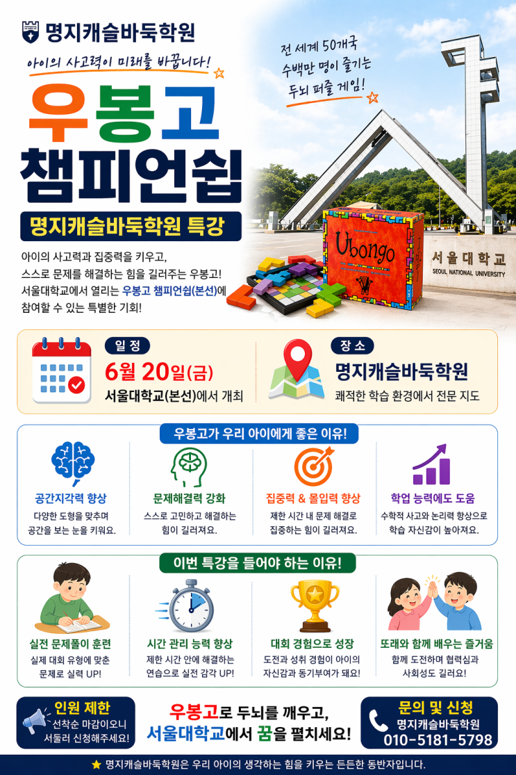 우리 아이 사고력을 바꾸는 기회 우봉고 챔피언십 특강 안내 안녕하세요 명지캐슬바둑학원입니다. 요즘 학부모님들께서 가장 많이 하시는 질문이 있습니다. “우리 아이, 머리는 좋은데 왜 문제를 끝까지 못 풀까요?” 그 이유는 단순합니다. 생각하는 훈련이 부족하기 때문입니다. 그래서 이번에 저희 학원에서는 아이들의 사고력과 집중력을 실제로 끌어올릴 수 있는 “결과가 달라지는 특강”을 준비했습니다. 서울대학교에서 열리는 진짜 경험 오는 6월 20일, 서울대학교에서 우봉고 챔피언십 본선이 진행됩니다. 이건 단순한 체험이 아닙니다. ✔ 목표를 가지고 준비하는 경험 ✔ 실제 경쟁 상황에서 집중하는 경....... <img src="https://blogthumb.pstatic.net/MjAyNjA0MjRfMjUx/MDAxNzc3MDI2NTEzNjY3.YOkOC-FuTXRIs0ZQ2C2JcqOfa39X1EBpCDOKZqc1gFIg.faid3dzrAqDpY1sCKiU0pkG2LNqT8ESWAmi2tUOFRZ4g.PNG/ChatGPT_Image_2026%B3%E2_4%BF%F9_24%C0%CF_%BF%C0%C8%C4_07_22_25.png?type=s3" />