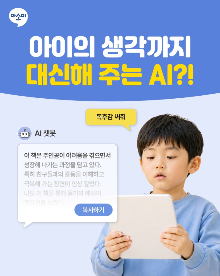 안녕하세요. “교육을 지킨다!” 유치~초2 전문 교육원 아소비입니다. 최근 인공지능 챗봇 사용이 많아지면서 ‘사유의 외주화’라는 말이 자주 등장하고 있습니다. 인공지능에게 질문을 하여 쉽게 해답을 얻어냄으로써 인간 스스로 생각을 정리하여 글로 쓰는 사유 과정을 인공지능에게 맡기고 있는 현상을 뜻하는 말입니다. 어떤 과제를 해결하기 위해서 필요한 자료를 찾는 과정, 여러 자료를 꼼꼼하게 읽고 이해하는 과정, 자신이 읽고 이해한 내용들을 분석하여 요점을 추려내고, 주제에 맞게 개요를 짠 뒤 글로 써 내려가는 과정, 그 모든 과정을 통해 학습이 이루어집니다. 이러한 과정은 오류와 실패를 직면하여 수정해 가며 의미를....... <img src="https://blogthumb.pstatic.net/MjAyNjA0MjhfMjE4/MDAxNzc3MzM4MzcxNTA3.tf1Mai-pTSX9mG1OhbDH6Jp6iMudF6m5baaZwV9-VjQg.vn8_1JTCKgxuqO7KSS6s2lMbWFoMuSK0F912EYsRpLYg.JPEG/260428_4%BF%F9_5%C1%D6%C2%F7_%B1%B3%C0%B0%C1%A4%BA%B8-01.jpg?type=s3" />