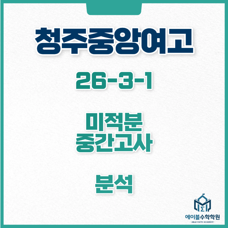 안녕하세요 에이블 수학학원입니다 청주 중앙여고 26년 3학년 1학기 미적분 중간고사에 대해 말씀드리겠습니다. 총평입니다 수능특강이 부교재로 대부분의 문항이 수능특강에서 출제되었습니다. 전반부 문제가 매우 쉬웠으며 뒤로 갈수록 어려워지는 구조로 출제되었습니다. 17,18, 20번이 변별 문항이며 자체 제작하신 문항으로 보입니다. 상당히 좋은 문항들로 구성되어 있어 수학을 잘 하는 학생이라면 재밌게 풀었을 것 같습니다. 수능특강을 반복적으로 학습한 학생이라면 1번부터 16번까지는 매우 쉽게 풀었을 것으로 예상하나 13번에서 계산이 말리는 학생도 있었을 것 같고, 17번부터는 멘붕이 왔을 것 같네요^^;;; 특히 좀 친다는 학생....... <img src="https://blogthumb.pstatic.net/MjAyNjA0MjRfMTUz/MDAxNzc2OTYxMTYyMjkw.4peNM8Nx8cncWQ1rjshrvC-vce8-6e0YWdgrqd_bbpQg.AHiBTD3qEeAkRNTr74rGs57xOKeiIa6aoXd-eR2s3UEg.PNG/%C1%A6%B8%F1%C0%BB_%C0%D4%B7%C2%C7%D8%C1%D6%BC%BC%BF%E4._%284%29.png?type=s3" />
