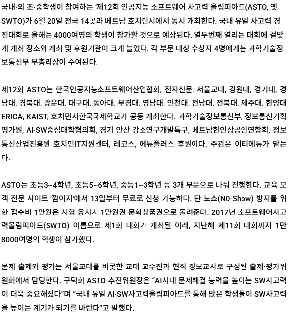 안녕하세요. 은평구 유일 입시/올림피아드 전문 초등*중등*고등 컴퓨터·코딩학원 이지코딩입니다. 다름이 아니옵고, 곧 있을 AI*SW 사고력 올림피아드가 개최되어 소식 전합니다 ^^ ♦️ 대회 일시 : 2026년 6월 20일(토) 13시~18시 10분 ♦️ 대회 대상 : 초등학교 3학년 ~ 중학교 3학년 ♦️ 개최 지역 : 전국 및 베트남 동시 개최 접수 링크 : https://edu.ggumeasy.com/?pn=product.view&cuid=&pcode=P9306-C0895-W2730 최근 에듀플러스 보도에 따르면, 제12회 AI·SW사고력올림피아드(ASTO)가 오는 2026년 6월 20일, 전국 14개 지역과 베트남 호치민에서 동시 개최됩니다. 이번 대회는 기존 SW사고력올림피아드(SWTO)....... <img src="https://blogthumb.pstatic.net/MjAyNjA0MTVfMjky/MDAxNzc2MjI0MTUxNjk0.94FyBETw4Ydpi5JPap6kEHQhI6LuYLNyHG_3B2yM1Ysg.Fe7Tmveed2yRxWRwyHBcnMH1HJYjG-qgEvbHs9VcQIEg.PNG/image.png?type=s3" />