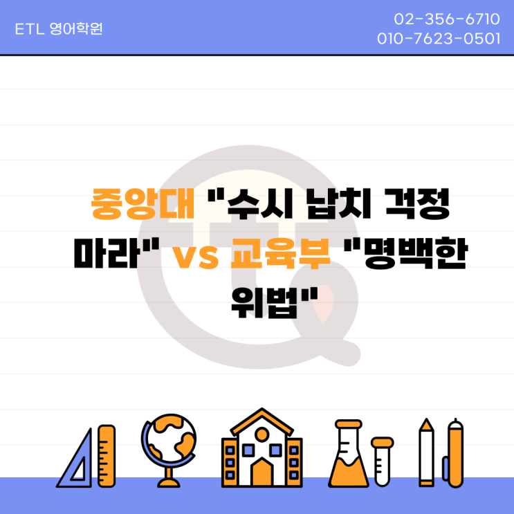안녕하세요! ETL 영어학원 입니다 최근 중앙대학교가 입학전형 설명회에서 파격적인 제도를 발표했습니다. 이름하여 'CAU 수능 케어'. 결론부터 말씀드리면, 이 제도는 현재 교육부로부터 "위법" 판정을 받으며 큰 논란이 되고 있습니다. 1. 'CAU 수능 케어'란 무엇인가요? 수험생들 사이에는 수시 전형에 지원했다가 수능 성적이 너무 잘 나와서 더 높은 대학에 갈 수 있음에도 불구하고, 이미 지원한 수시 대학에 합격해 버리는 상황을 '수시 납치'라고 부릅니다. 중앙대는 이를 방지하기 위해 수시 지원자 중 수능 성적이 우수한 학생이 원할 경우, 대학 측에서 합격 대상에서 제외(사정 제외)시켜 주....... <img src="https://blogthumb.pstatic.net/MjAyNjA0MjNfNzIg/MDAxNzc2OTQ0MDYyNDQx.DVaZIt8ajlC7dLHVfRi5yjS9e-qzozOnONEbaX5Fg8Eg.HN6TwXwwtx0u_n7tJNgDKZpCcR_FS2o_EVlw6-XYcAIg.PNG/%BA%ED%B7%CE%B1%D7-%B4%EB%C7%A5%C0%CC%B9%CC%C1%F6-001.png?type=s3" />
