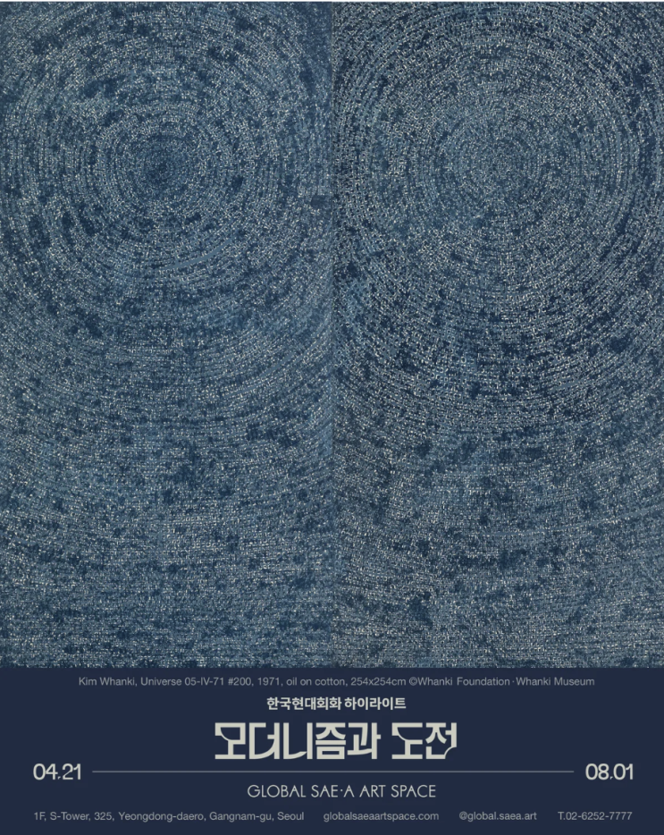 안녕하세요 서대문바른이에요 한국현대회화의 하이라이트를 한 곳에서 만나보실 수 있습니다. ◆ 글로벌세아 아트스페이스 한국현대회화 하이라이트 모더니즘과 도전 [기간] 2026.04.21 - 08.01 [장소] 글로벌 세아 아트스페이스 서울특별시 강남구 영동대로 325 1층 [참여작가] 권옥연 김환기 김기창 김종학 김창열 류경채 박고석 박래현 박서보 윤중식 이성자 이우환 정상화 하종현 한국현대회화 하이라이트: 모더니즘과 도전 April 21 - August 1, 2026 글로벌세아 아트스페이스(Global Sae-A Art Space)는 2026년 4월 21일부터 8월 1일까지 한국 현대미술의 형성과 전개 과정을 입체적으로 조망하는 《한국현대회화 하이라이트: 모더니즘과 도....... <img src="https://blogthumb.pstatic.net/MjAyNjA0MThfMTk3/MDAxNzc2NDkzNzU4MDU1.ky93VH4tumGq-WGSPMHII6uzyHwyfybVm0R5RbCMP2Qg.pCeY6E1nVFEd-d35DtkCMr132lcxQQhVJ_w3zXX2HWUg.PNG/image.png?type=s3" />